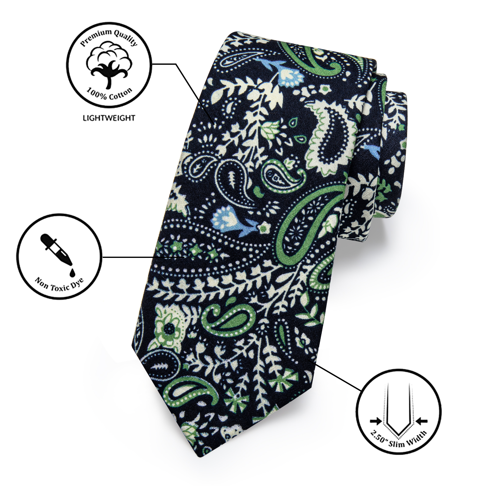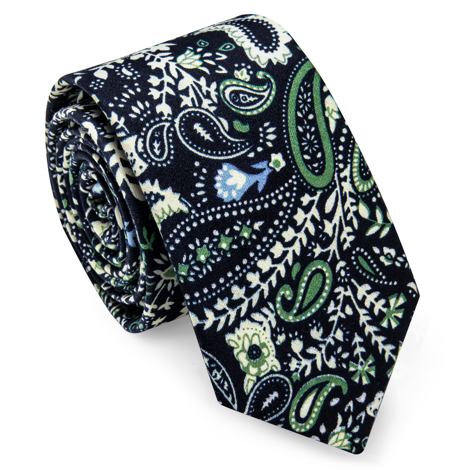 Etiquetas: Algodón, Azul, Blanco, Corbatas estrechas, Corbatas Slim, Negro, Paisley, Verde