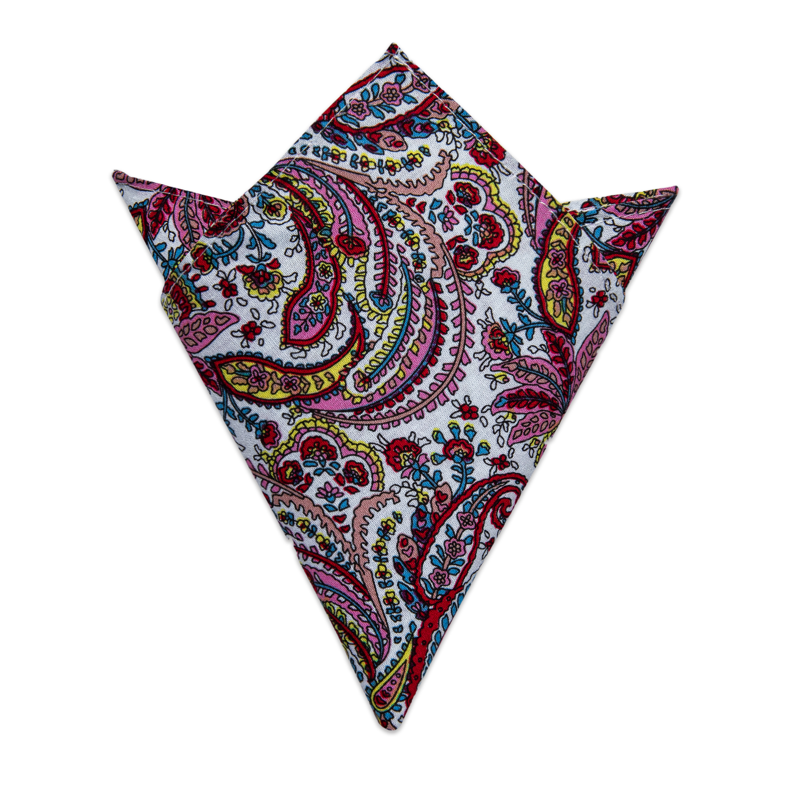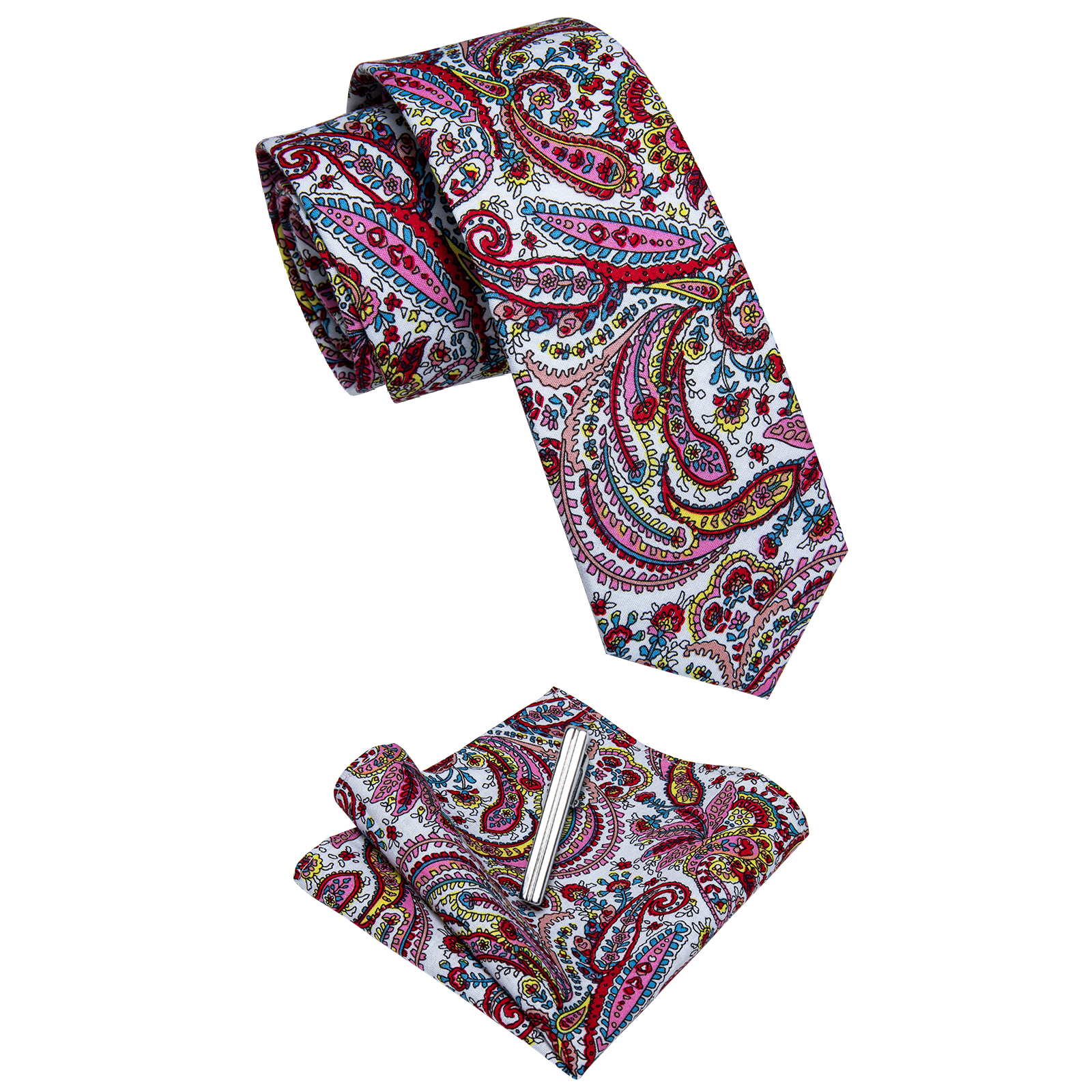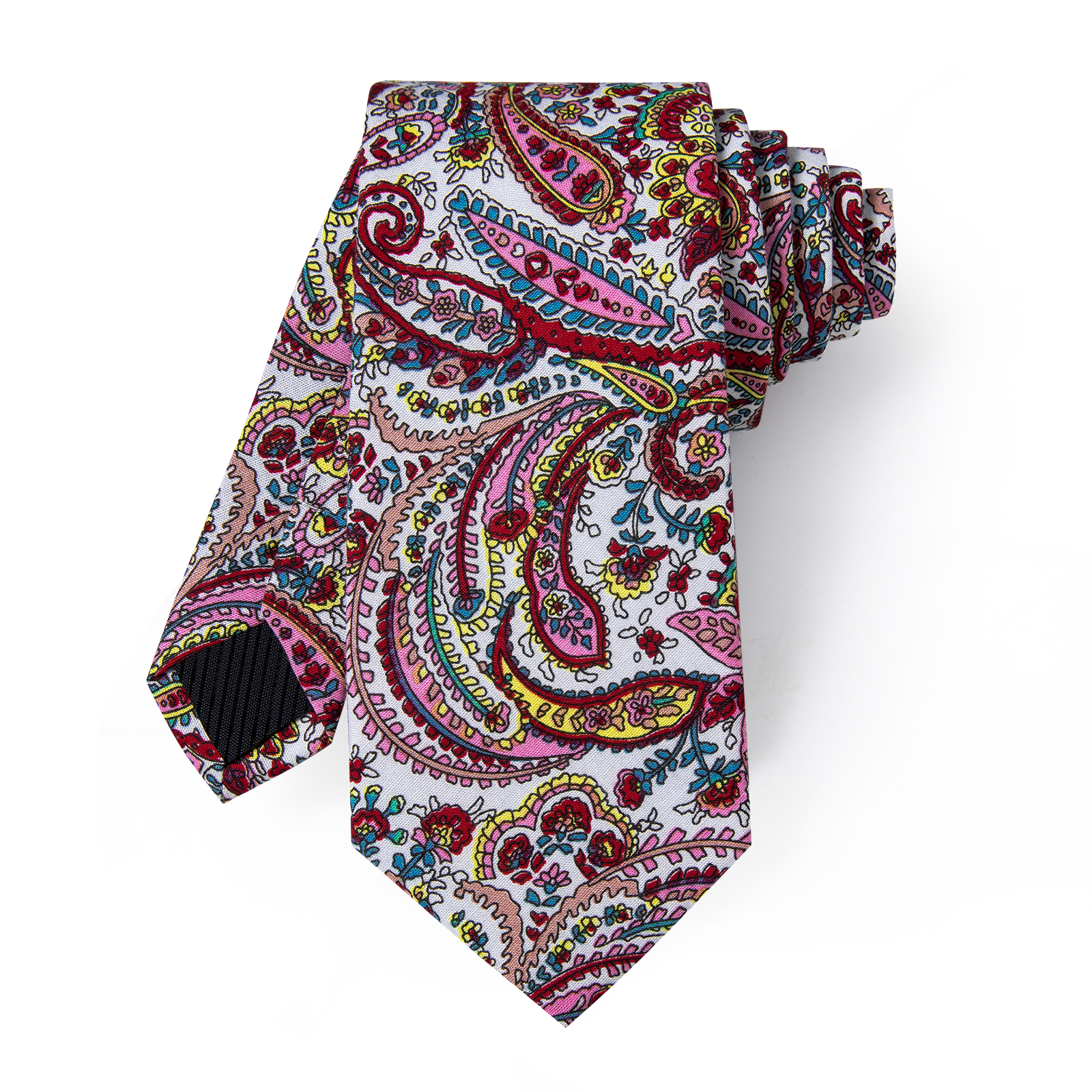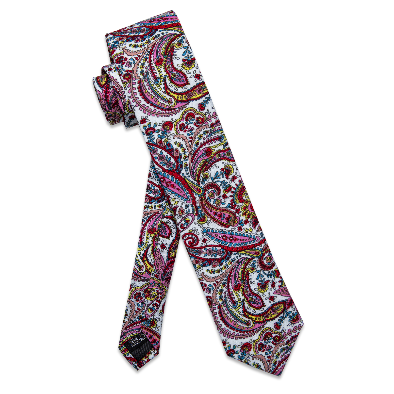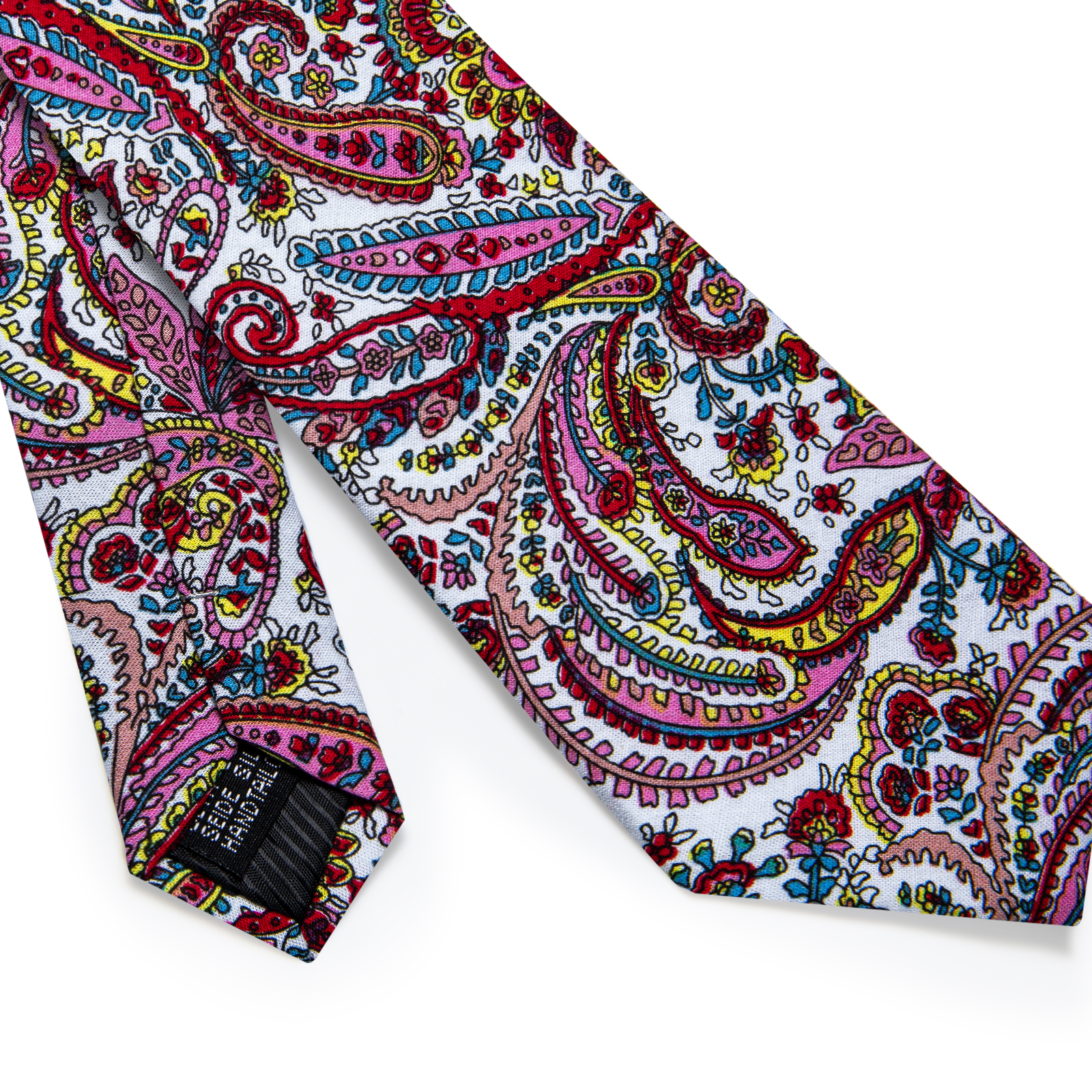 Esta corbata presenta un patrón paisley detallado en tonos vibrantes de rojo, amarillo y azul, sobre un fondo blanco clásico, confeccionada con seda de primera calidad.