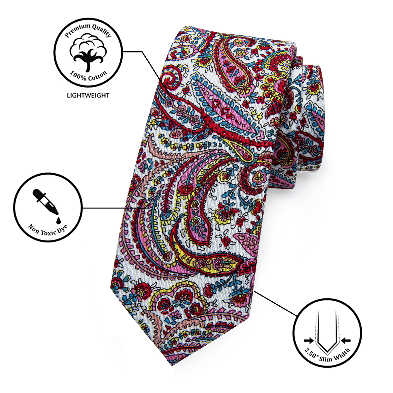 La Corbata Delgada de Celebración Paisley presenta un patrón paisley detallado en vibrantes tonos de rojo, amarillo y azul sobre un fondo blanco clásico, confeccionada con seda de primera calidad, perfecta para soirées sofisticadas.