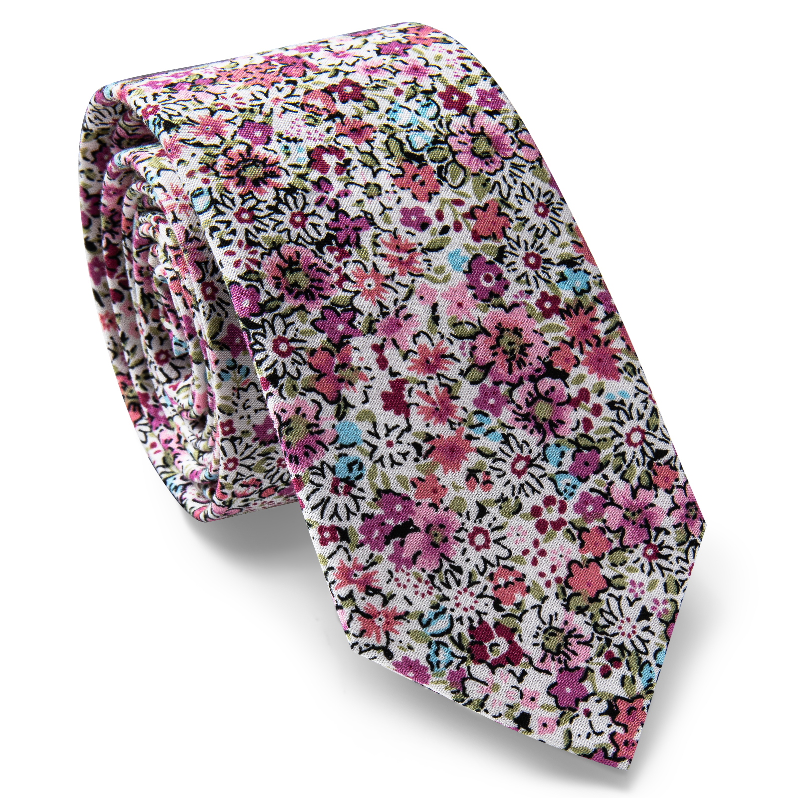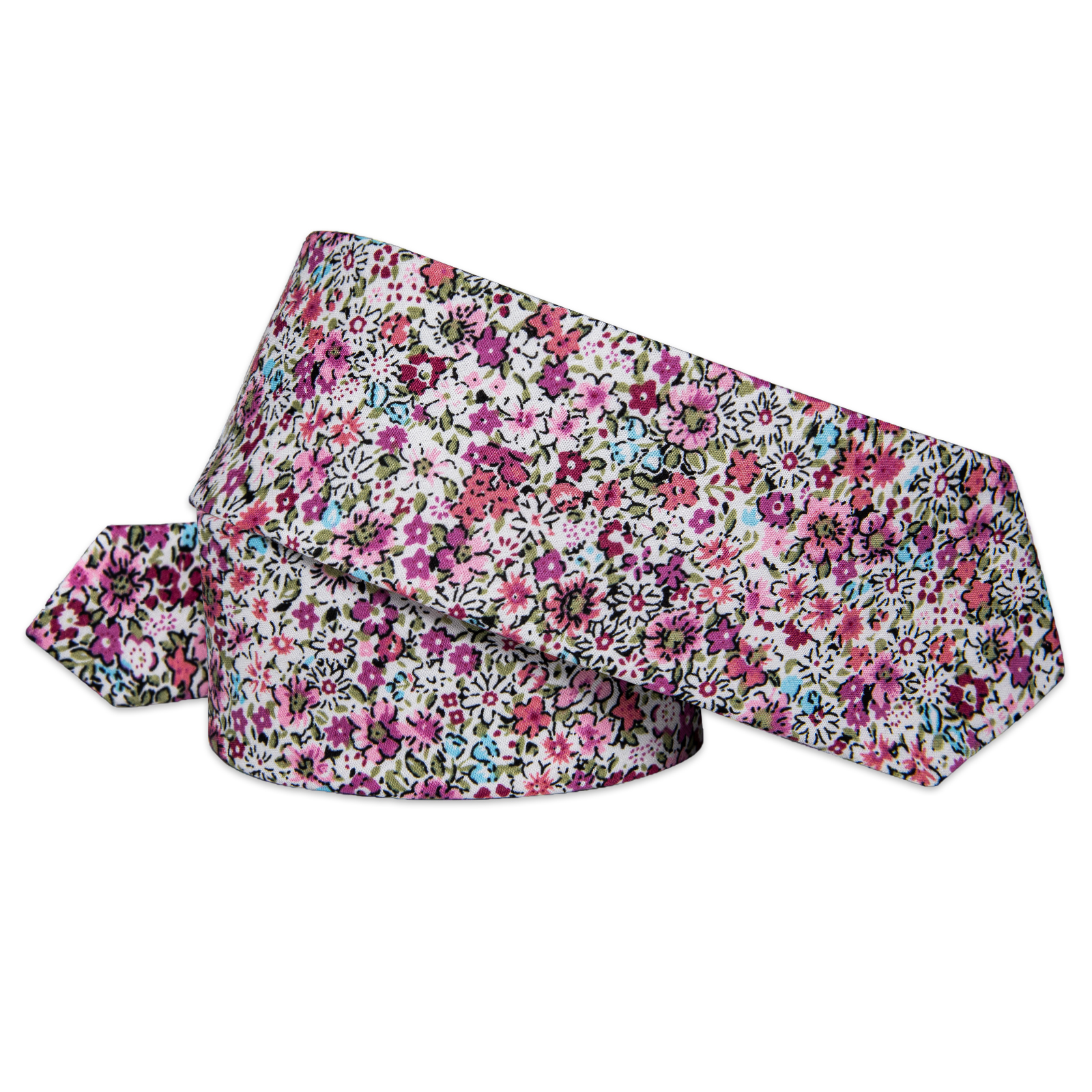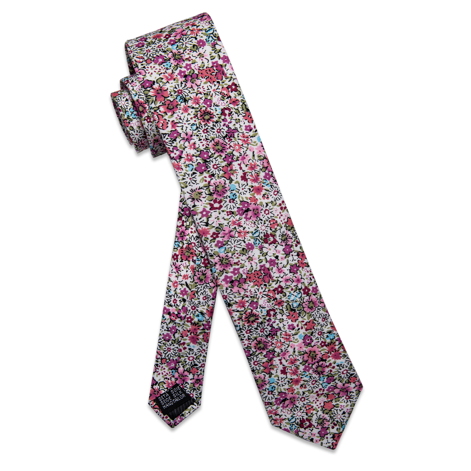La Corbata Delgada Floral de Prado Primaveral presenta un delicado patrón floral en rosa, verde y blanco sobre un fondo claro, confeccionada con seda de alta calidad, perfecta para eventos primaverales.