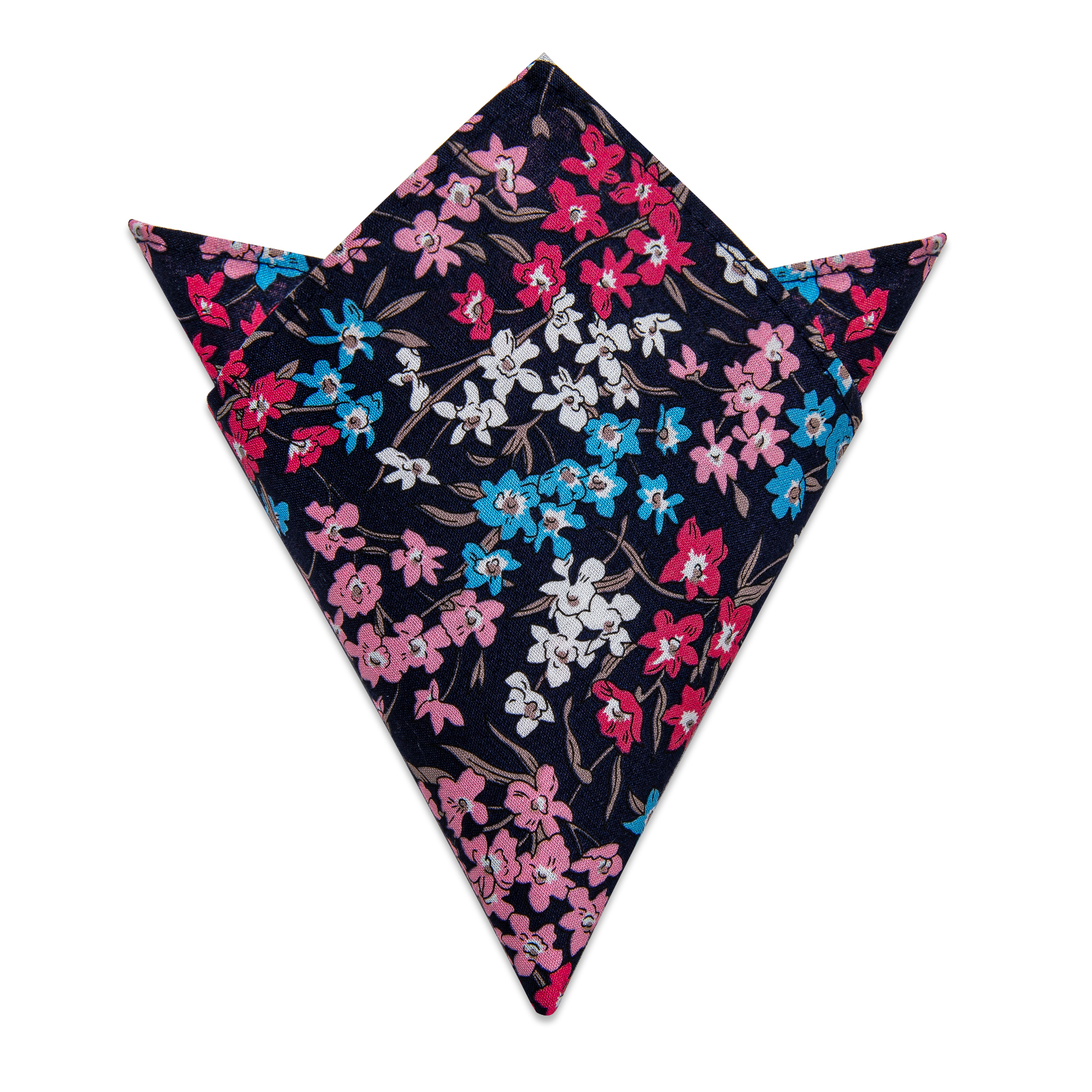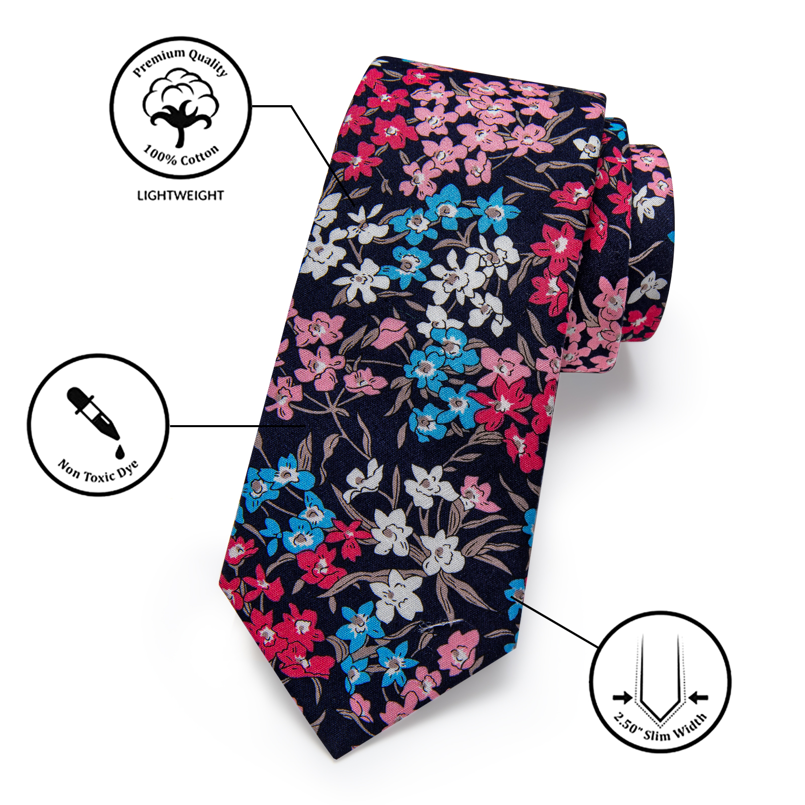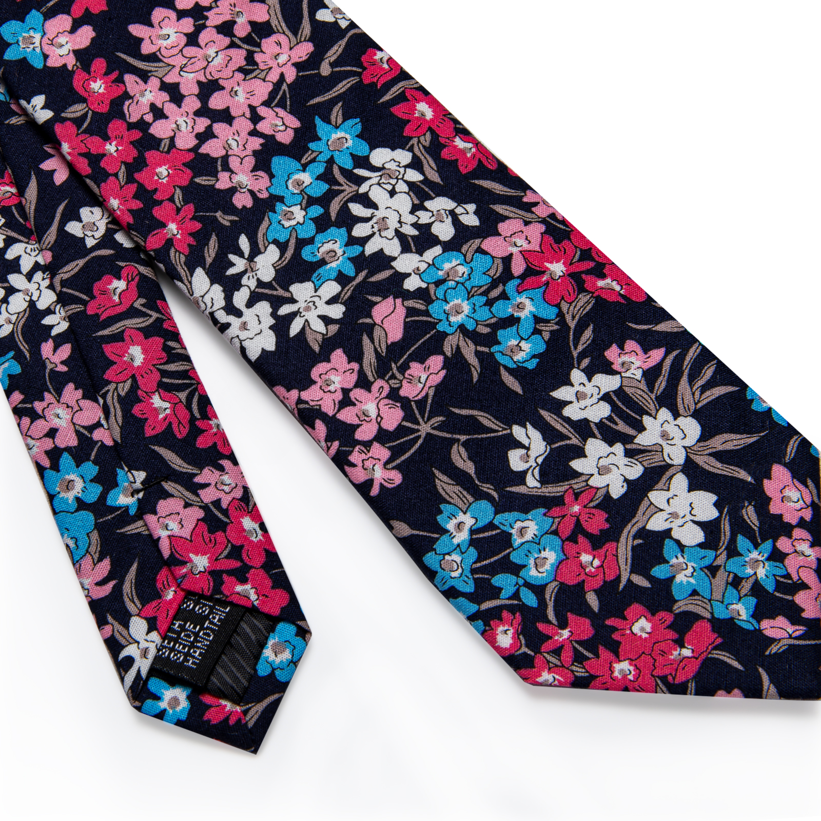 La Corbata Delgada Floral Blossom Elegance presenta un delicado patrón floral en rosa, blanco y azul sobre un fondo azul marino, confeccionada con seda de la más alta calidad, perfecta para ocasiones distinguidas.