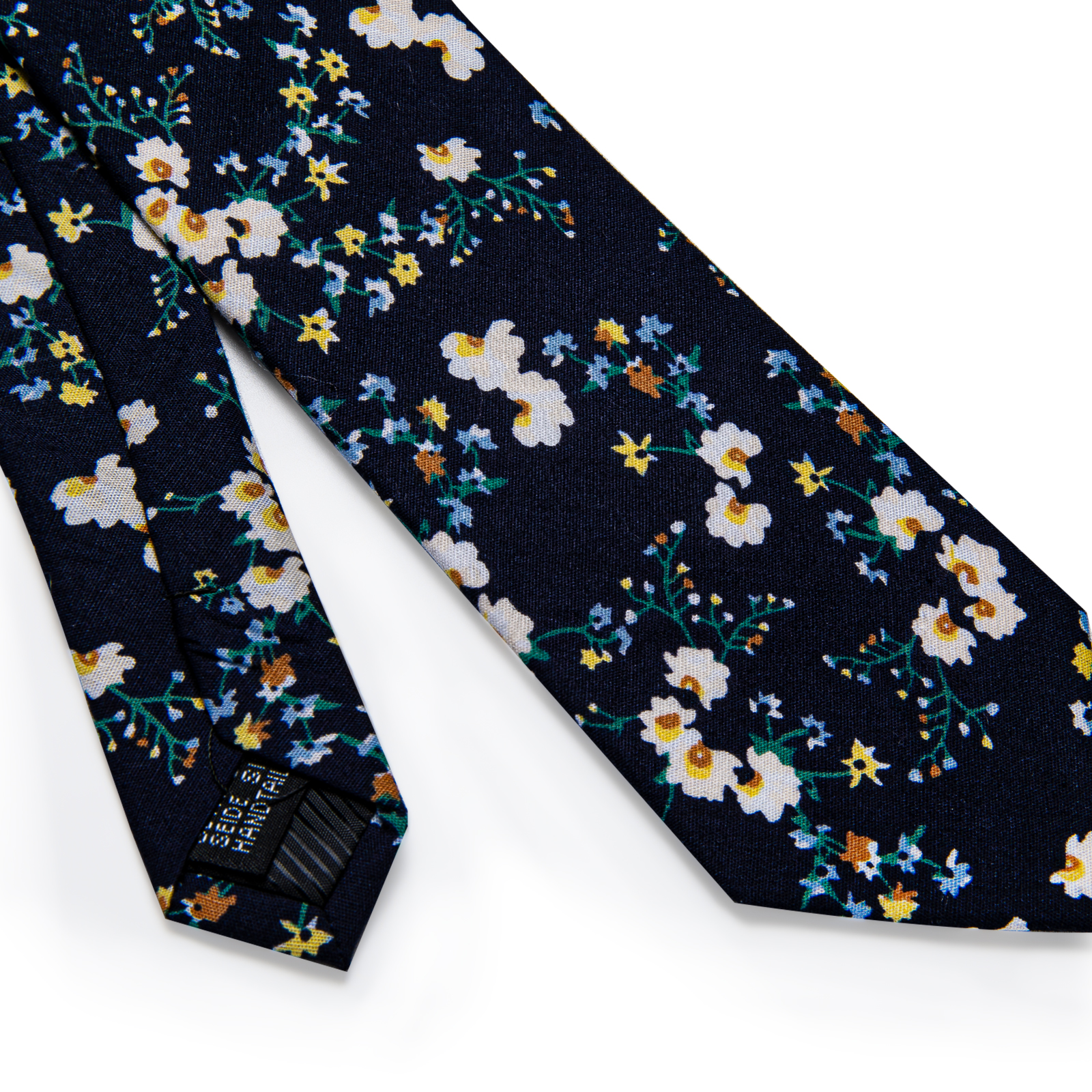 Permita que la elegancia del crepúsculo resplandezca con la corbata Twilight Bloom. Presentando un fondo oscuro con intrincados motivos florales en tonalidades alegres, esta corbata emana una gracia y encanto atemporal.