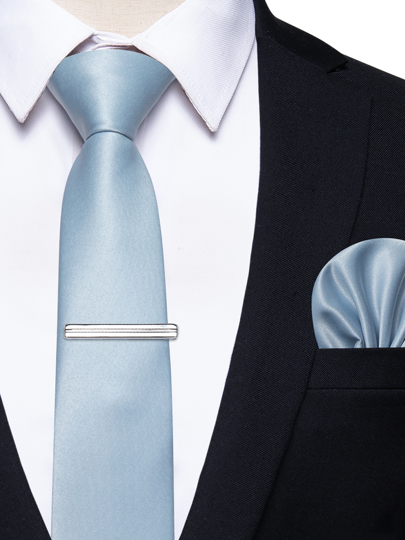 Una corbata satinada azul cielo serena para una presencia pulida y calmante.