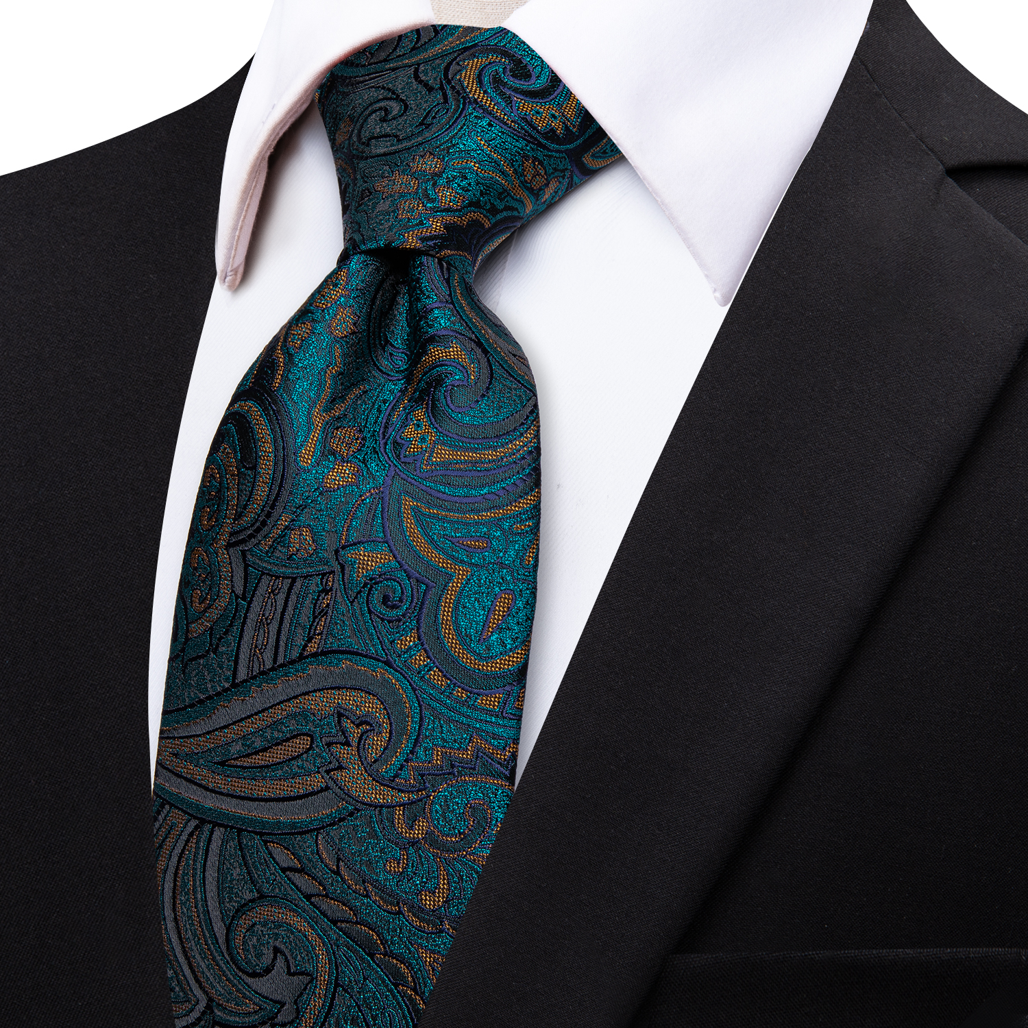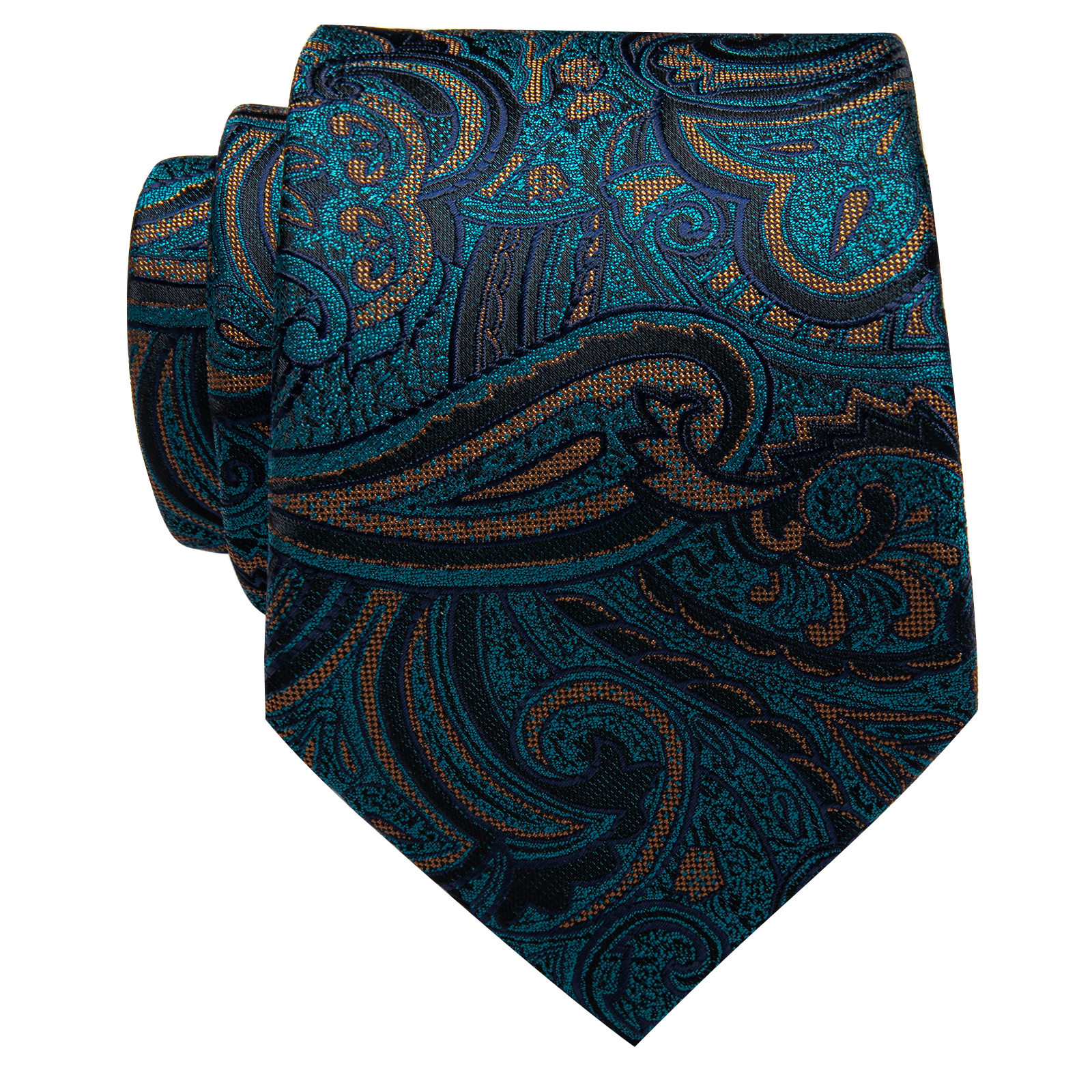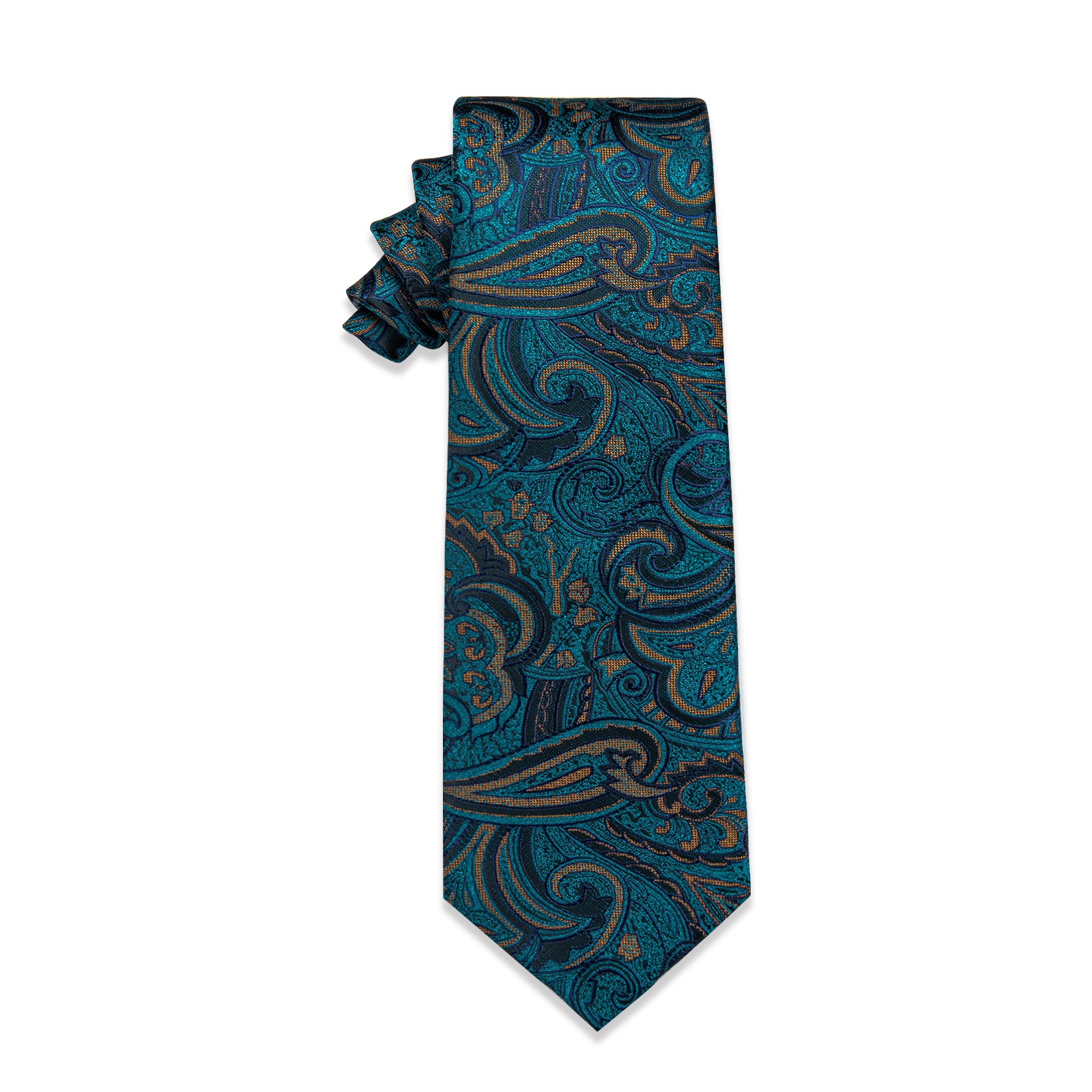 Dive into a swirl of luxurious patterns with the Emerald Whirl Tie. The intricate design, combined with rich teal and emerald tones, evokes a sense of depth and sophistication. Perfect for the gentleman who seeks to blend classic style with a contemporary flair, this tie is ideal for both formal occasions and refined business settings.