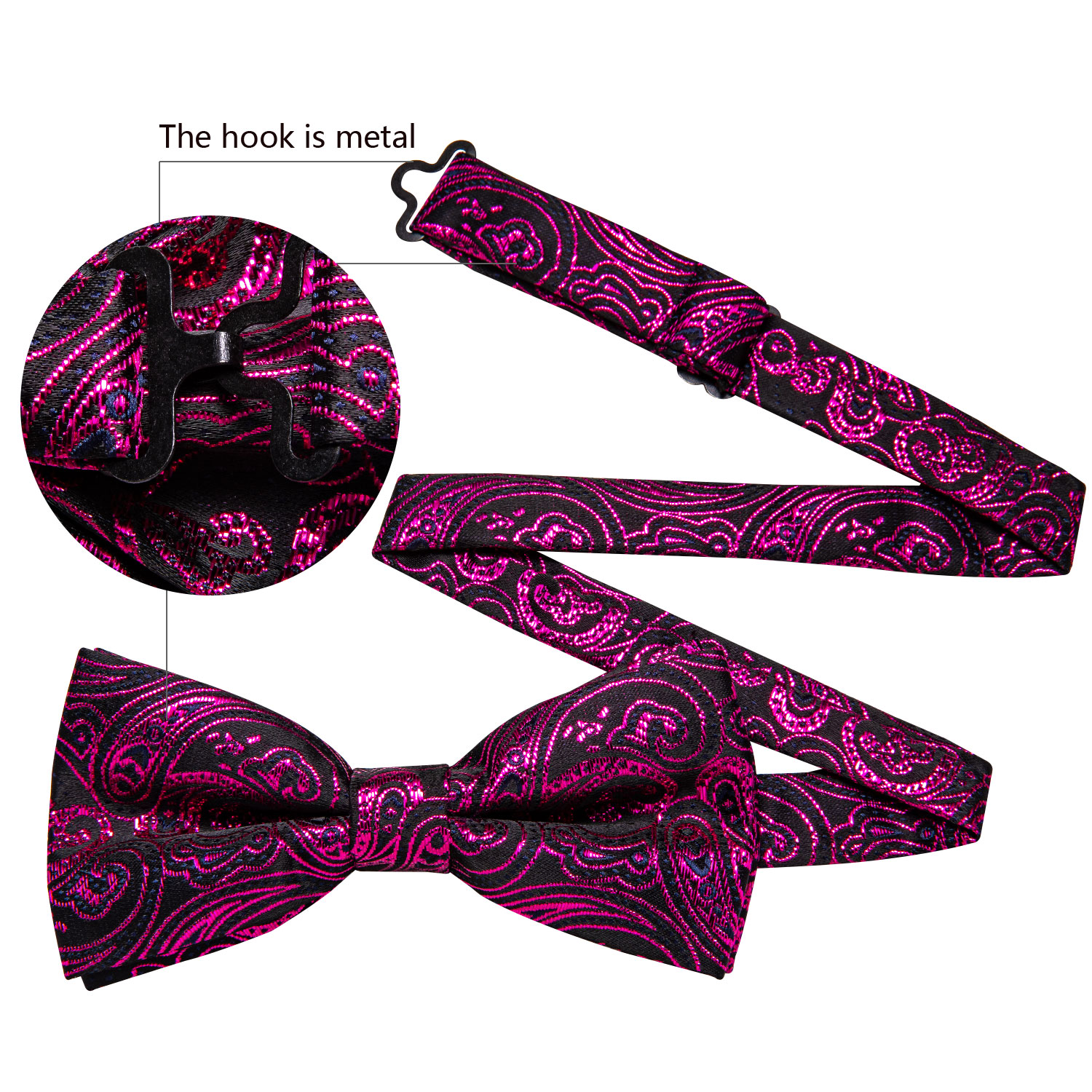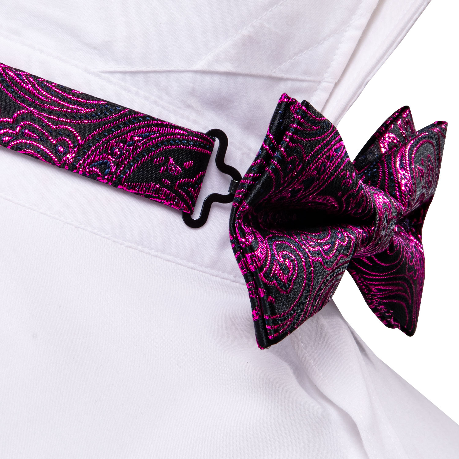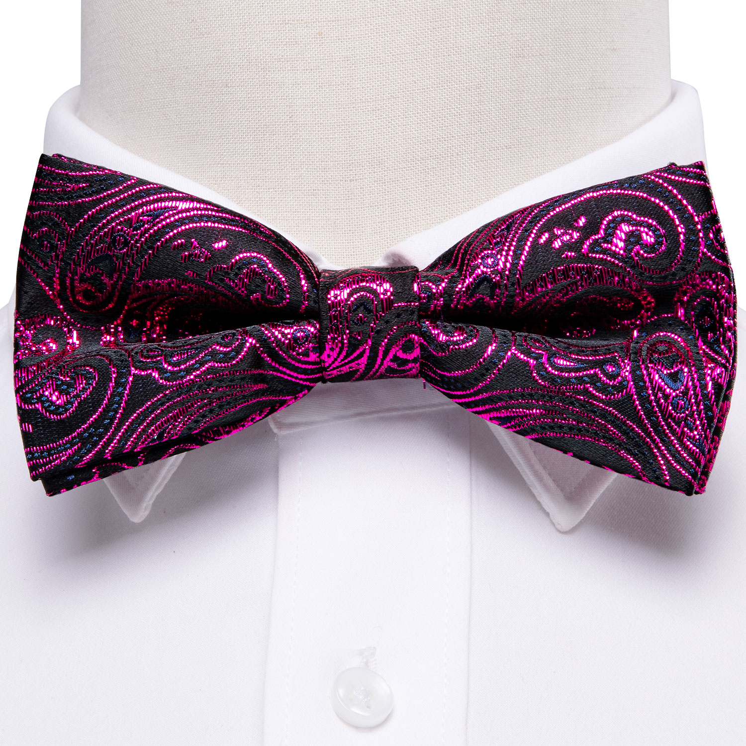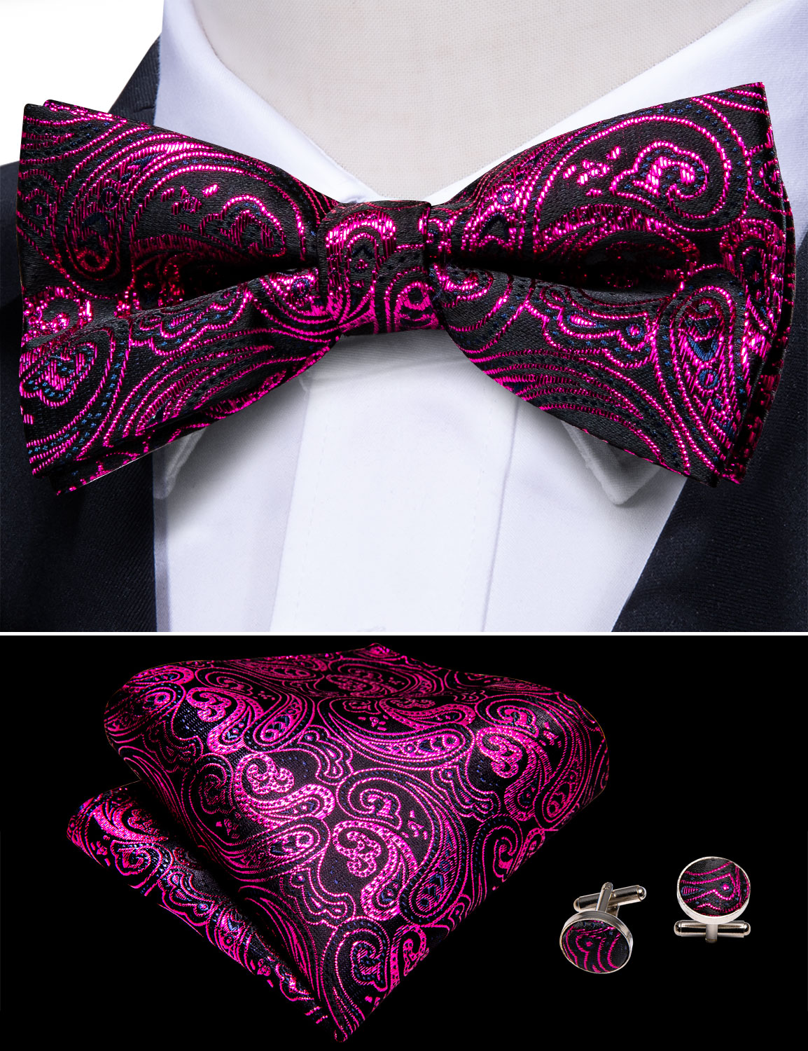 The Fuchsia Noir Fuchsia Paisley Bow Tie is a bold black and fuchsia paisley bow tie with a matching pocket square and cufflinks.