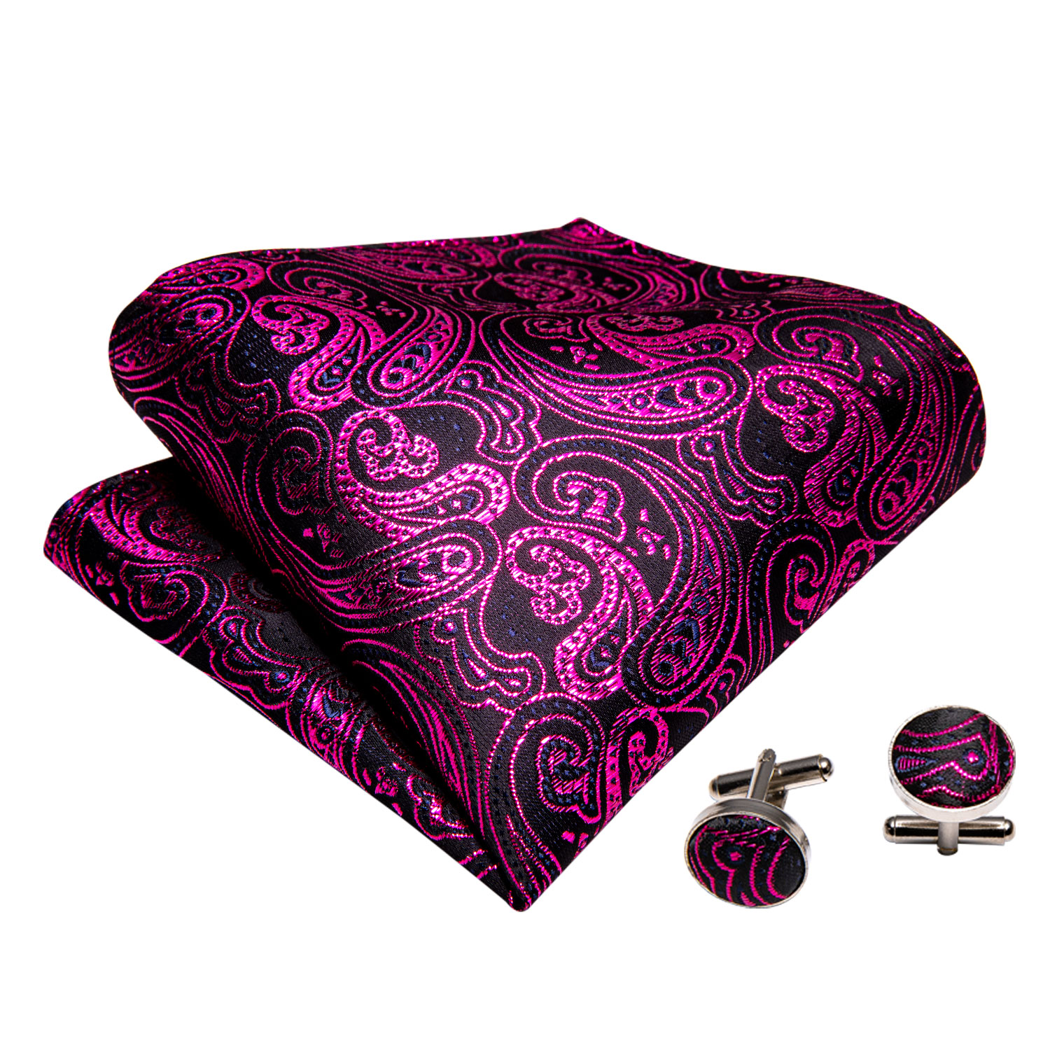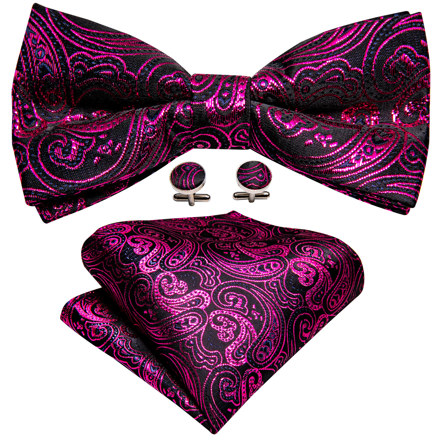 The Fuchsia Noir Paisley Bow Tie stands out with its deep black base and vibrant fuchsia paisley pattern. The set includes a matching pocket square and cufflinks, making it perfect for formal events or adding flair to your outfit.