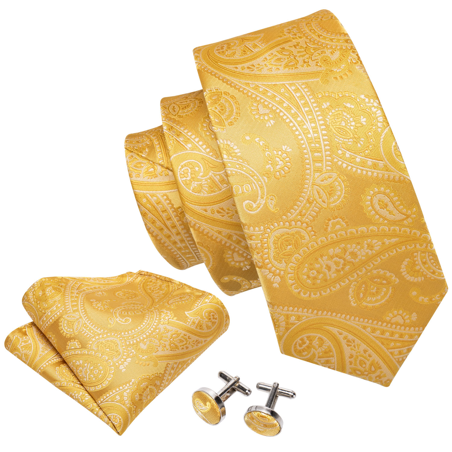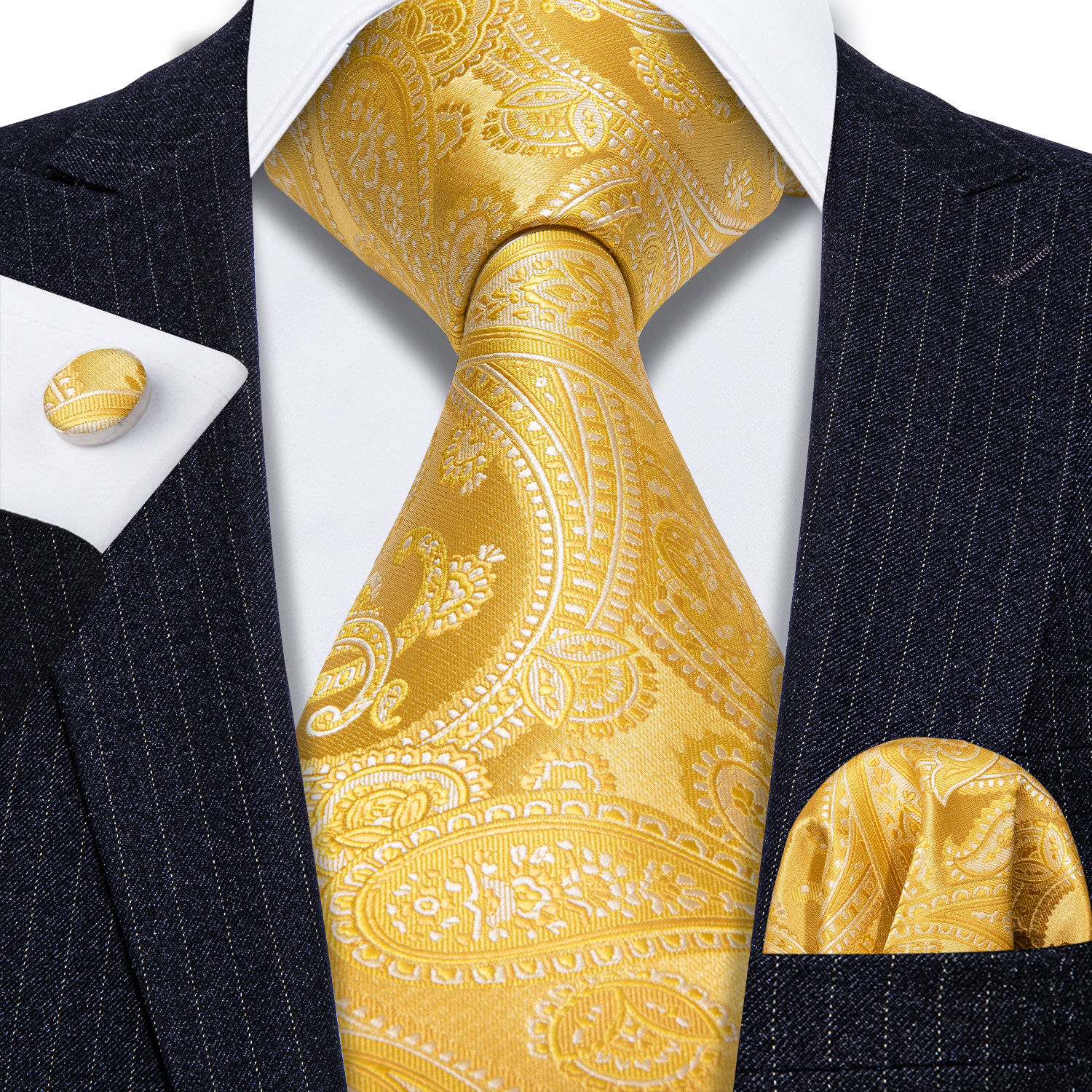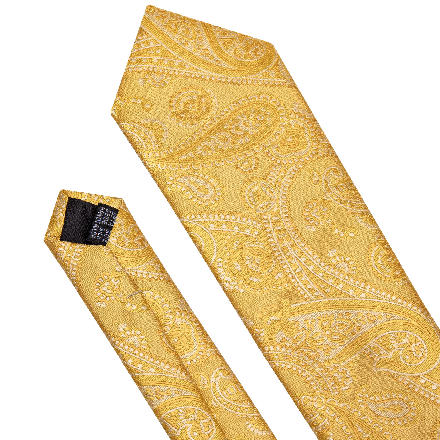 Drape yourself in the opulence of the Golden Majesty Paisley Tie, adorned with a luxurious golden yellow hue and intricate paisley patterns that exude regality and sophistication.