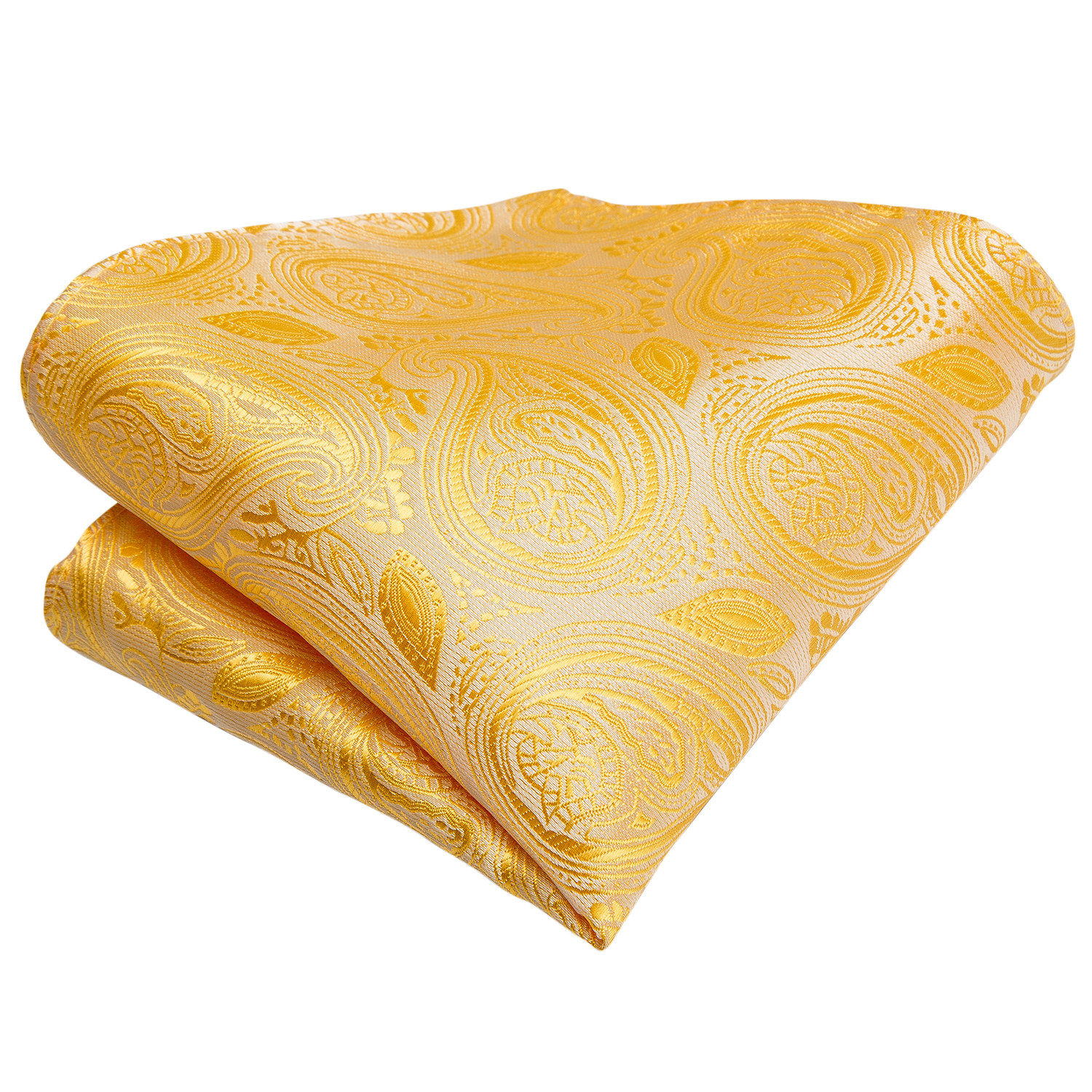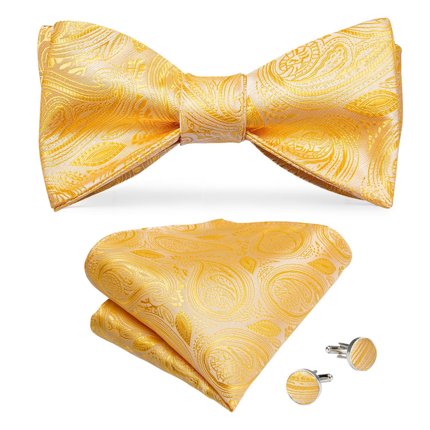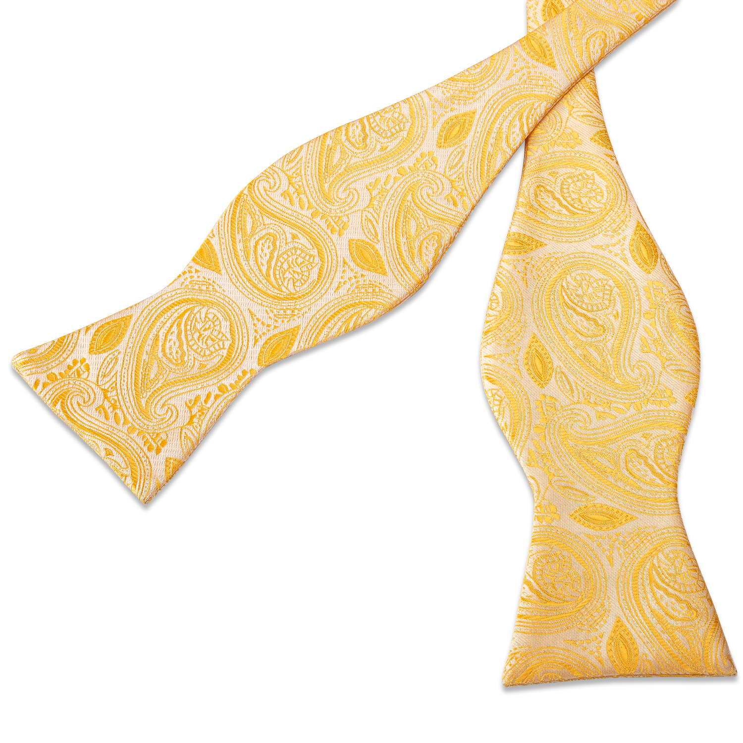 The Golden Sunrise Paisley Bow Tie features an exquisite paisley pattern in vibrant golden yellow, crafted from luxurious silk, perfect for special occasions.