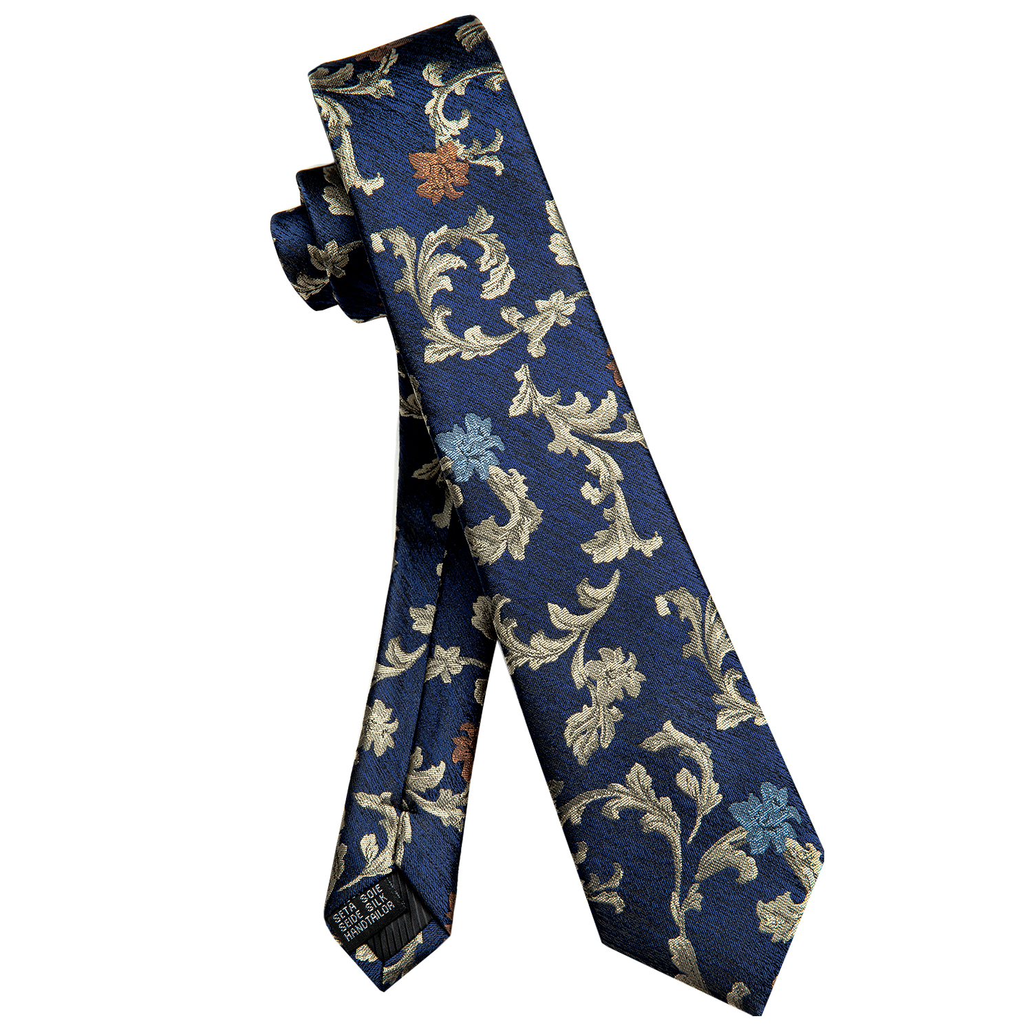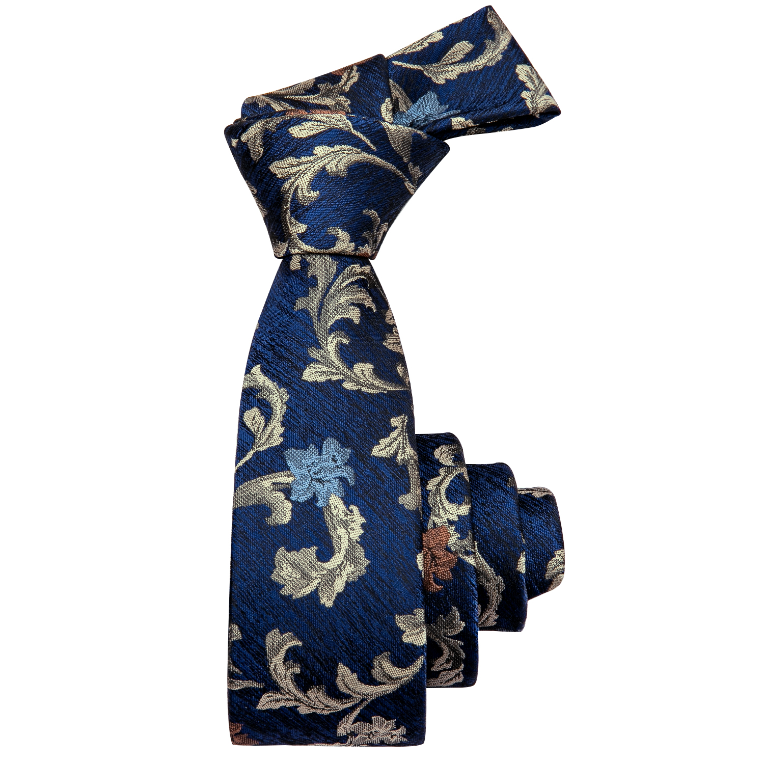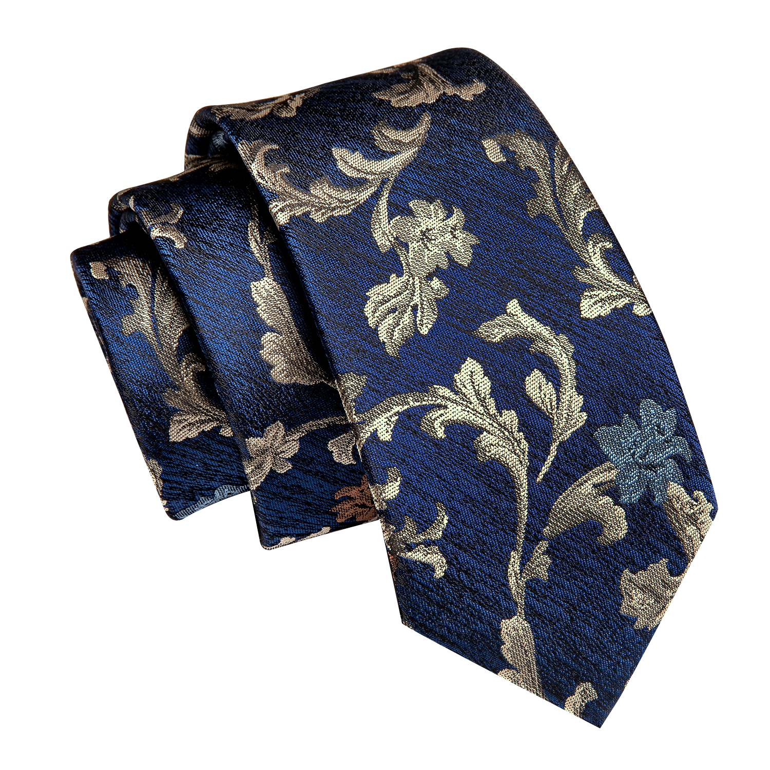 Add a touch of luxury to your outfit with the Golden Vine Floral Skinny Tie, featuring golden vines and bronze florals against a navy base.