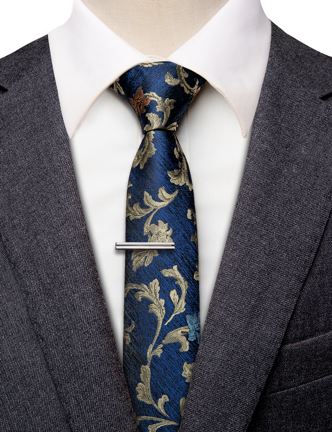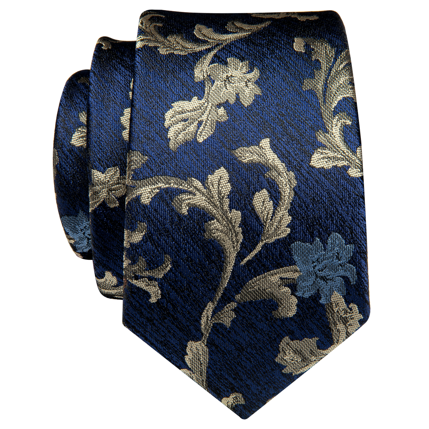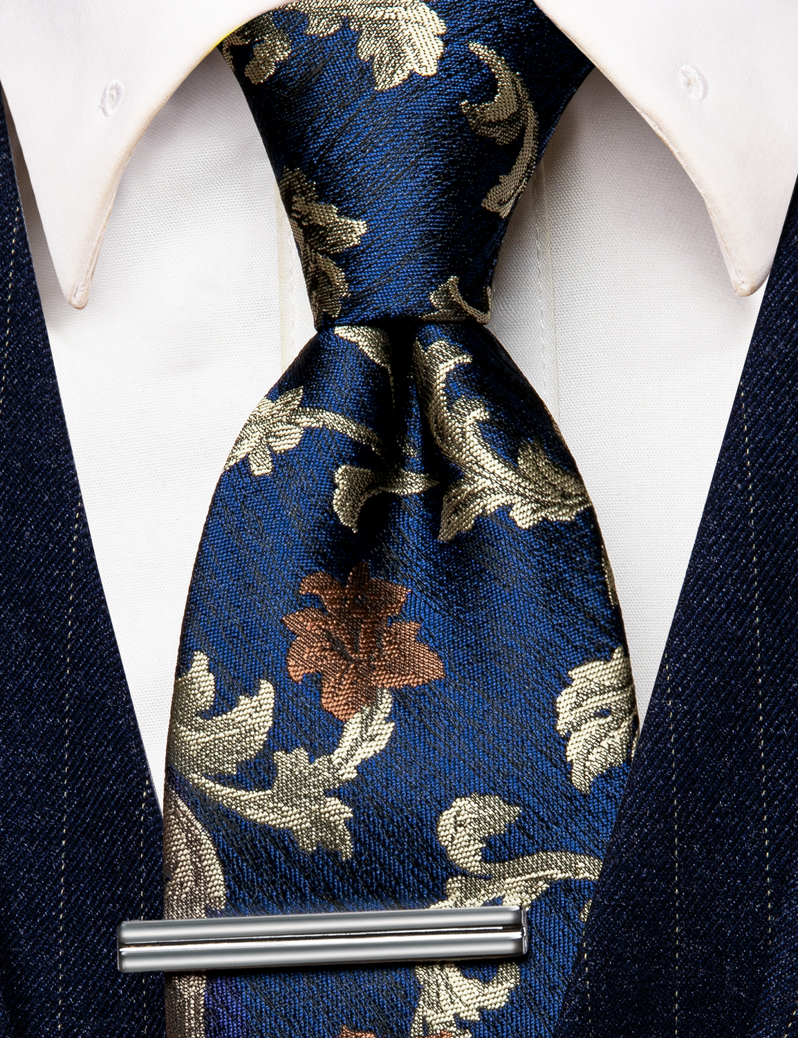 Add a touch of luxury to your outfit with the Golden Vine Floral Skinny Tie, featuring golden vines and bronze florals against a navy base.