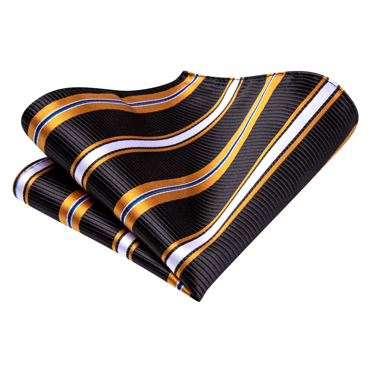The Goldline Command Striped Tie Set is all about precision. A dark, ribbed backdrop makes the golden stripes pop, while thin white and blue lines add balance and modernity. Ideal for formal events or professional settings where style matters, this set includes a matching pocket square and cufflinks to tie it all together.