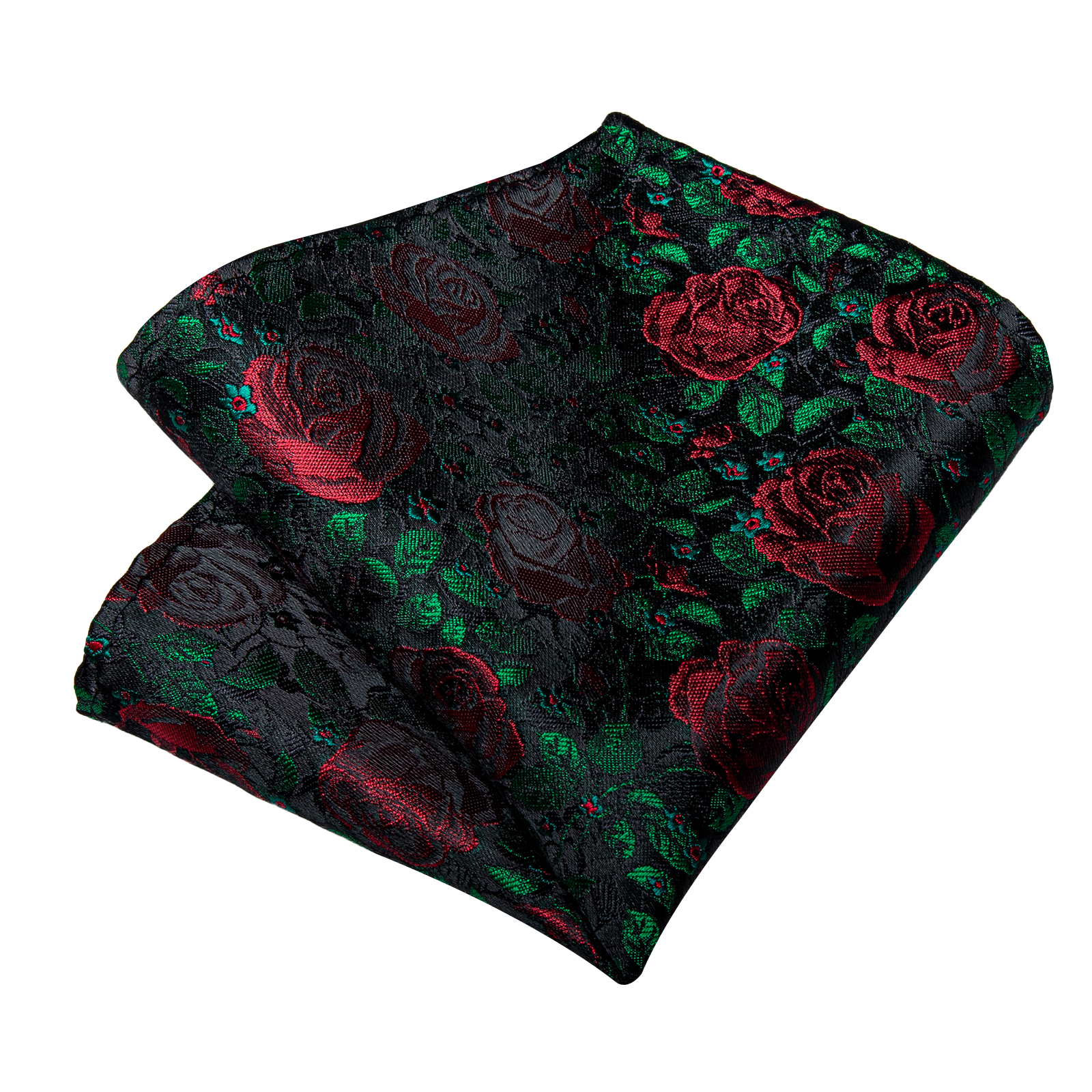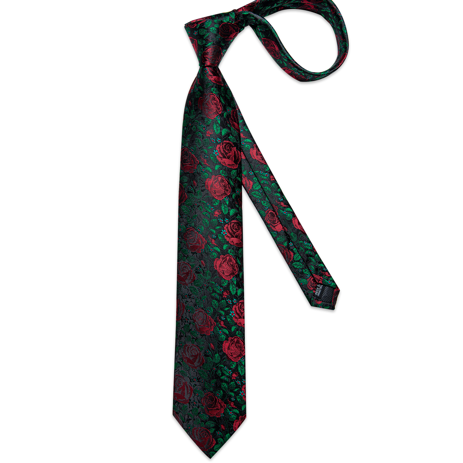An elegant tie featuring dark jade leaves and ruby roses, ideal for evening wear.