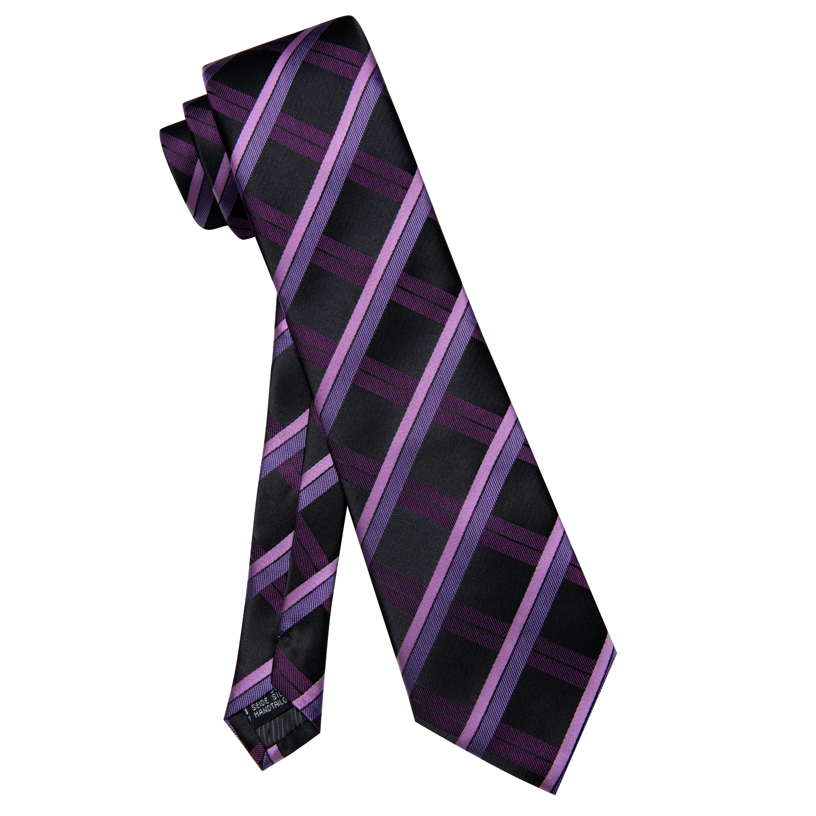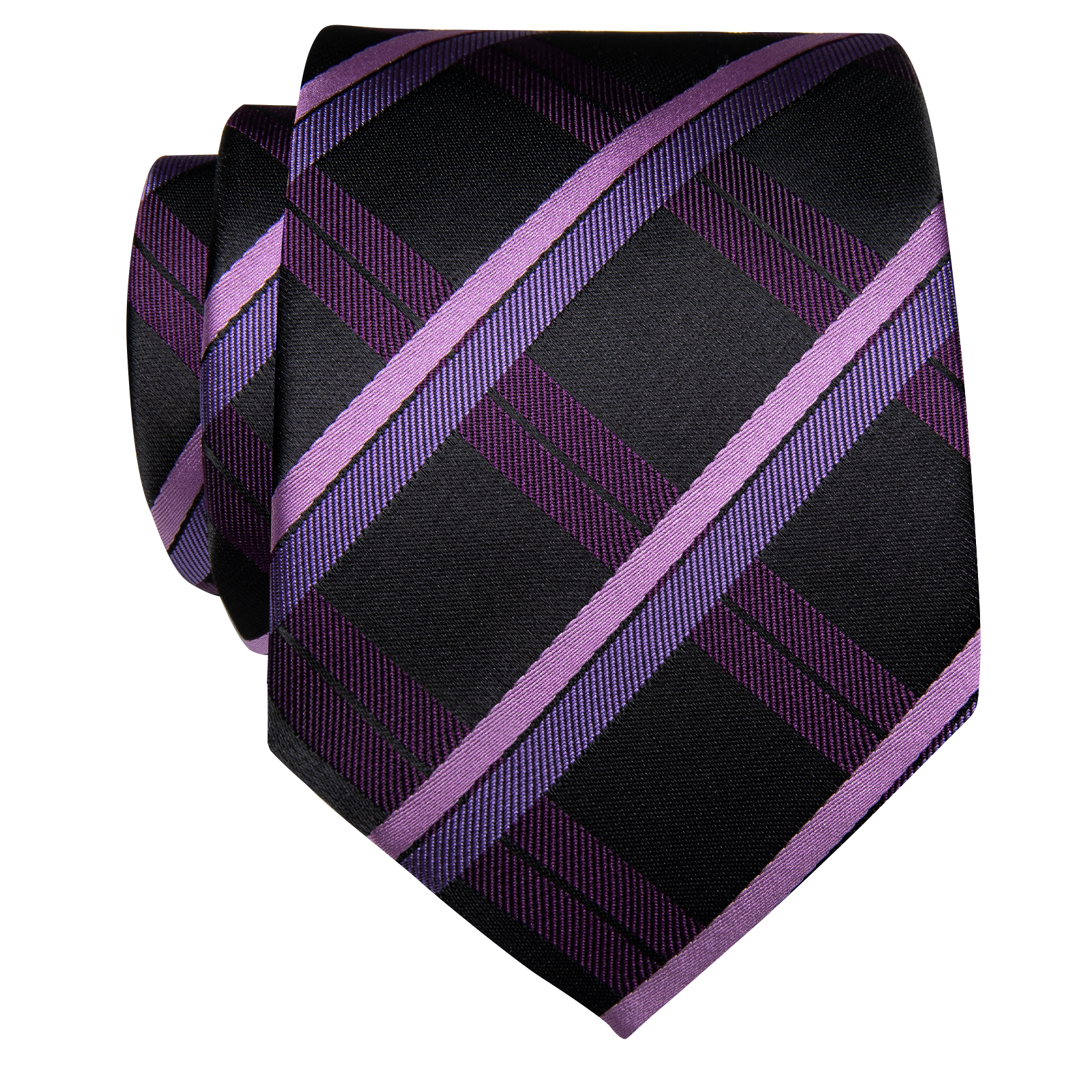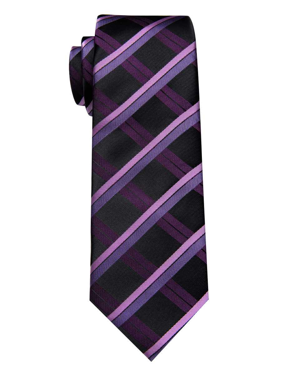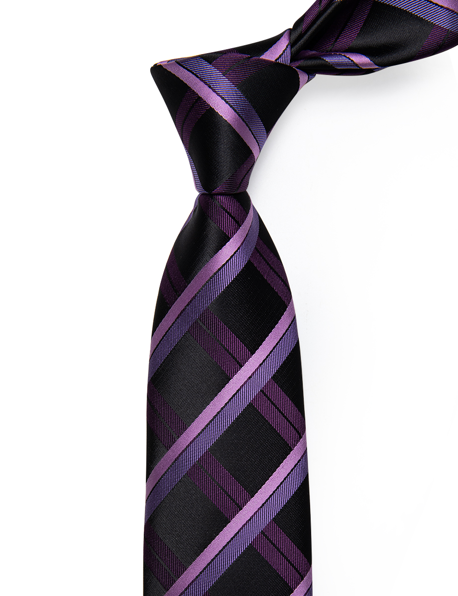 The Midnight Grid Plaid Tie features a sleek black background with striking purple and lavender diagonal plaid lines. Its bold yet balanced design makes it an excellent choice for business attire, weddings, or any event that calls for a sharp, polished look.