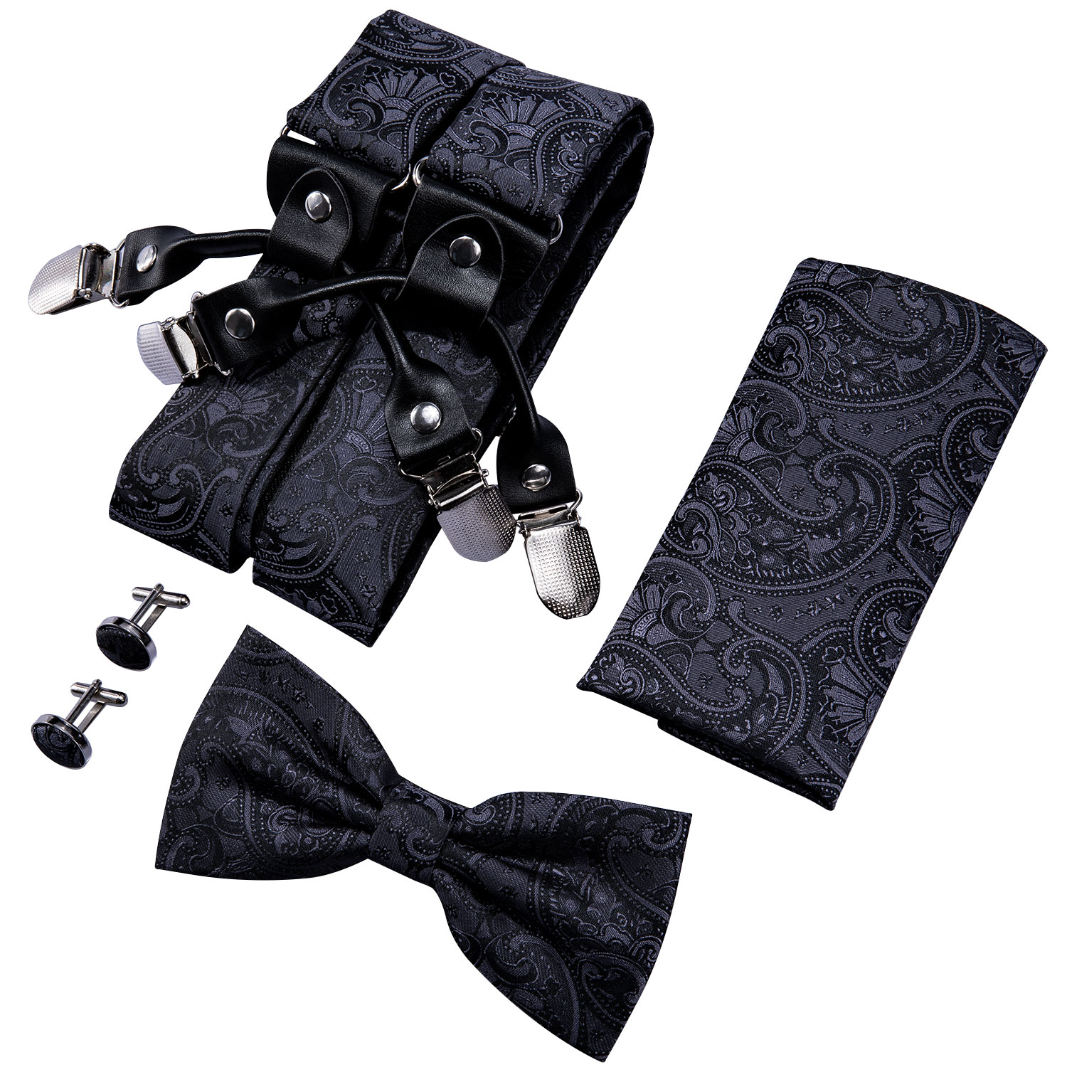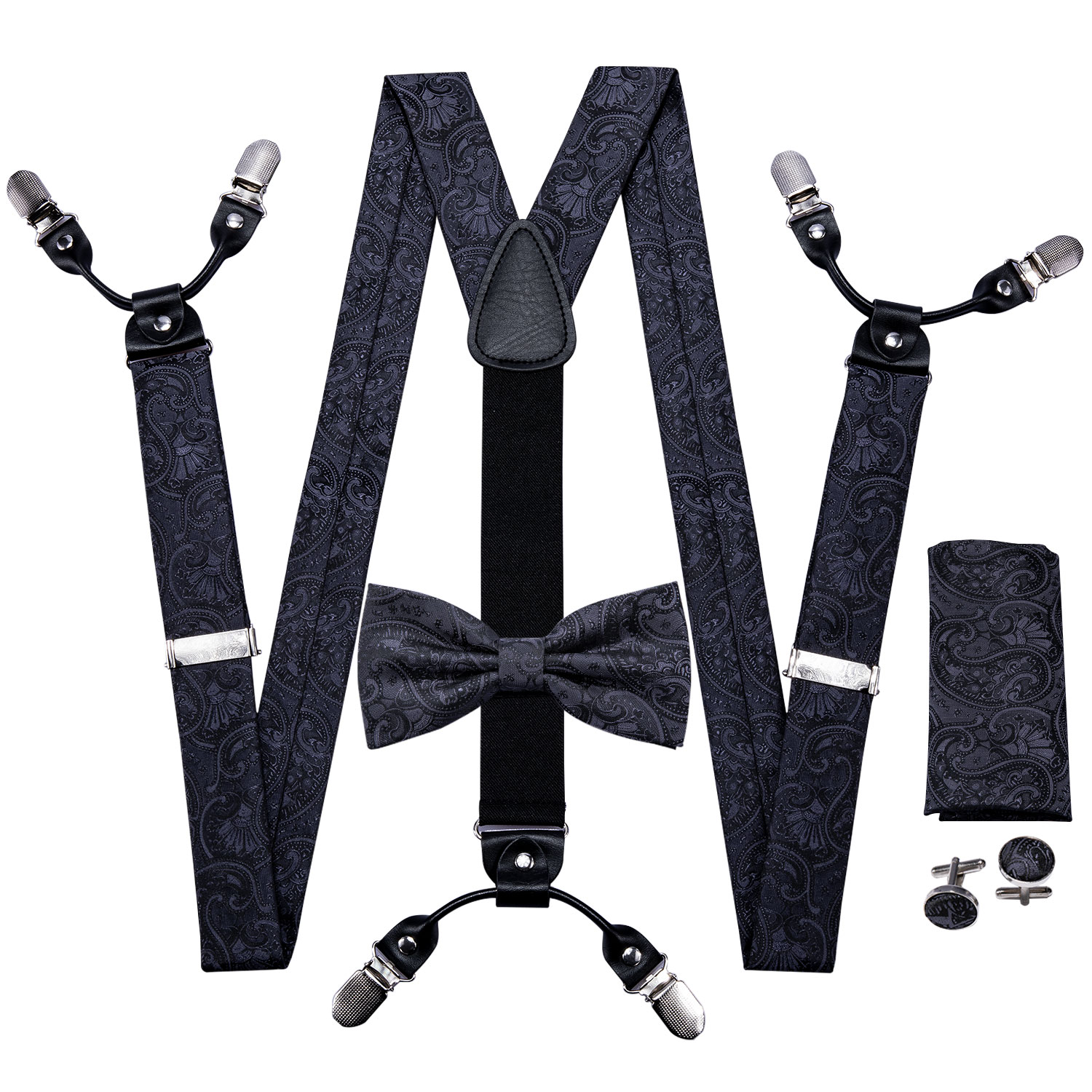 Elevate your formalwear with the Noir Prestige Paisley Suspenders. Featuring an intricate black paisley design, these suspenders are crafted from high-quality materials to ensure durability and a sophisticated look. Ideal for weddings, corporate events, and upscale occasions, the Noir Prestige Paisley Suspenders provide a sleek and polished appearance. The set includes a matching bow tie, pocket square, and cufflinks for a complete and elegant look. Adjustable straps and secure clips guarantee a comfortable and reliable fit.
