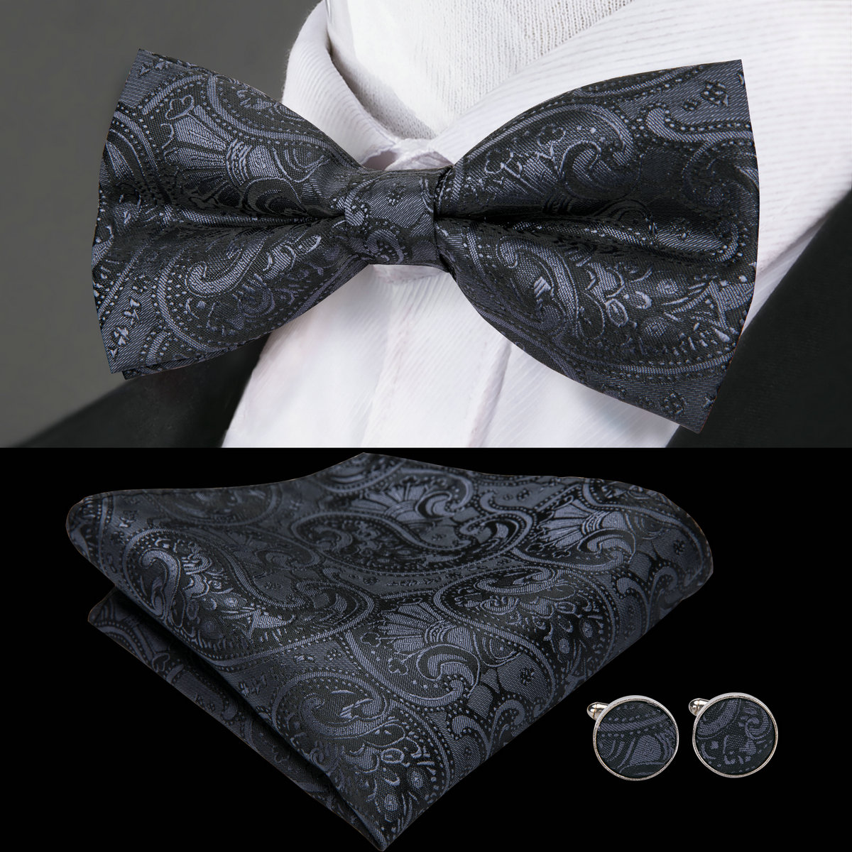 The Noir Royale Paisley Bow Tie features a detailed black paisley design, woven from premium silk, ideal for formal events and special occasions