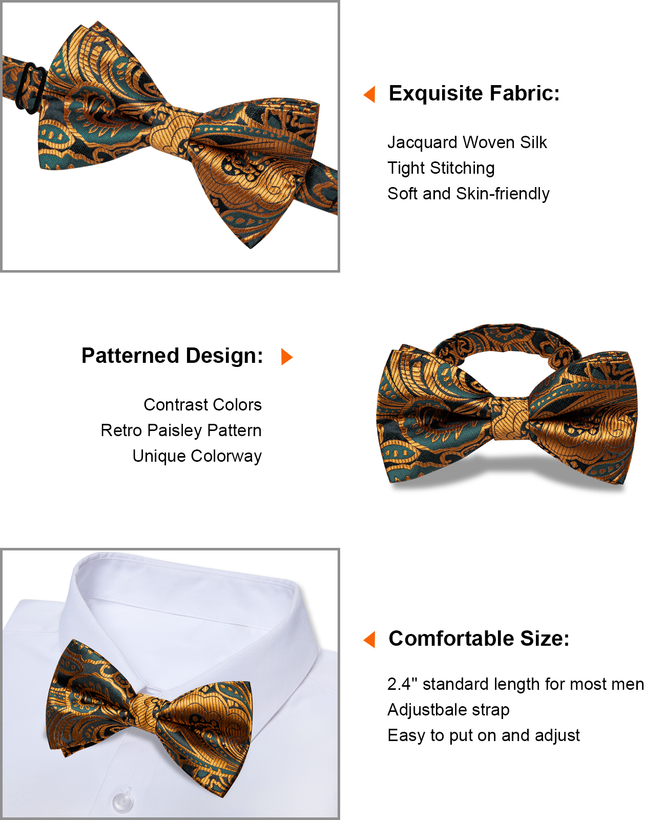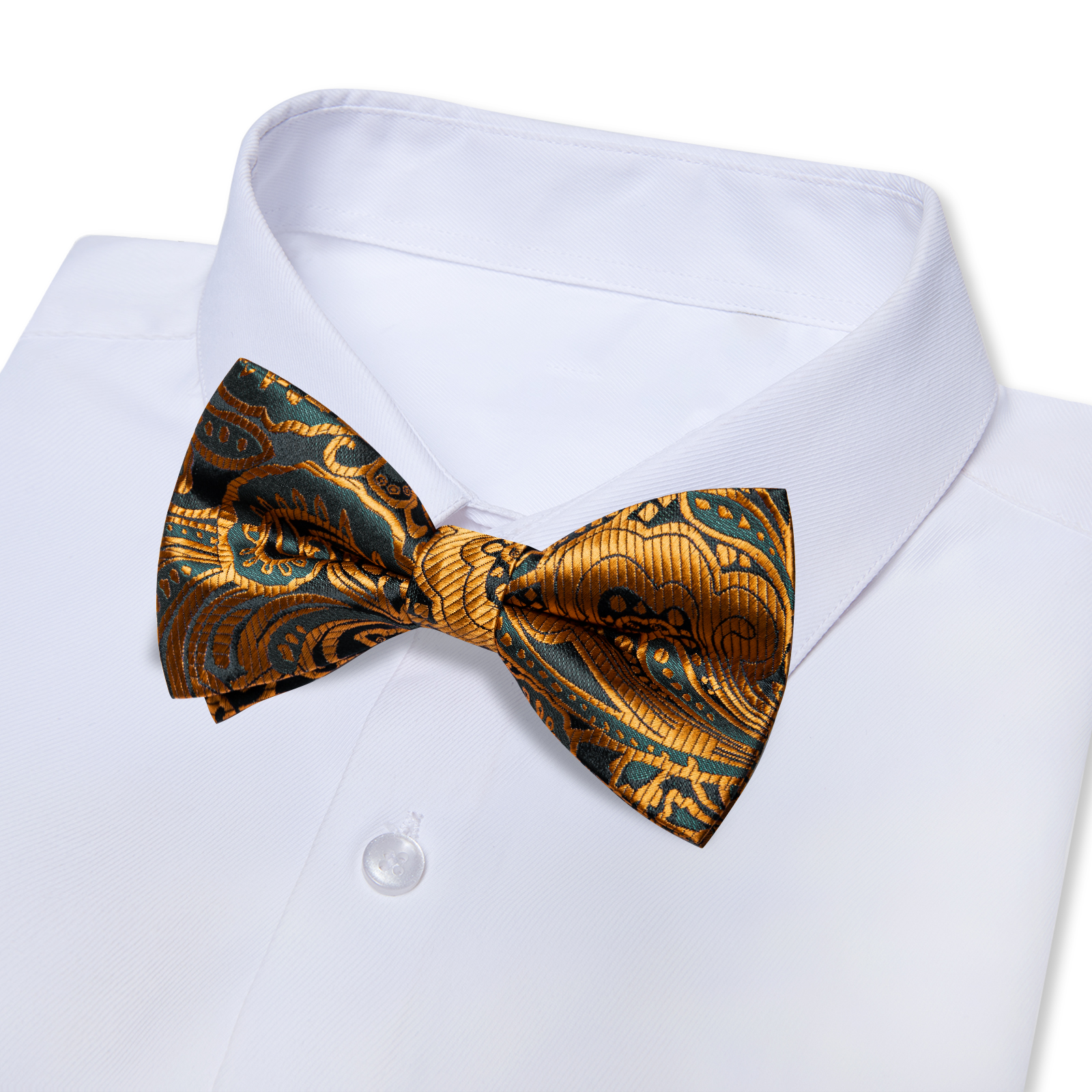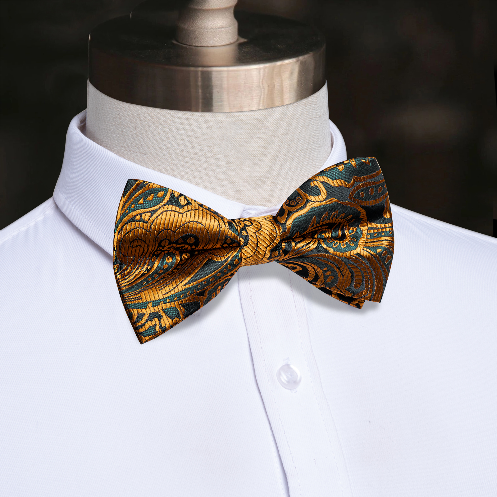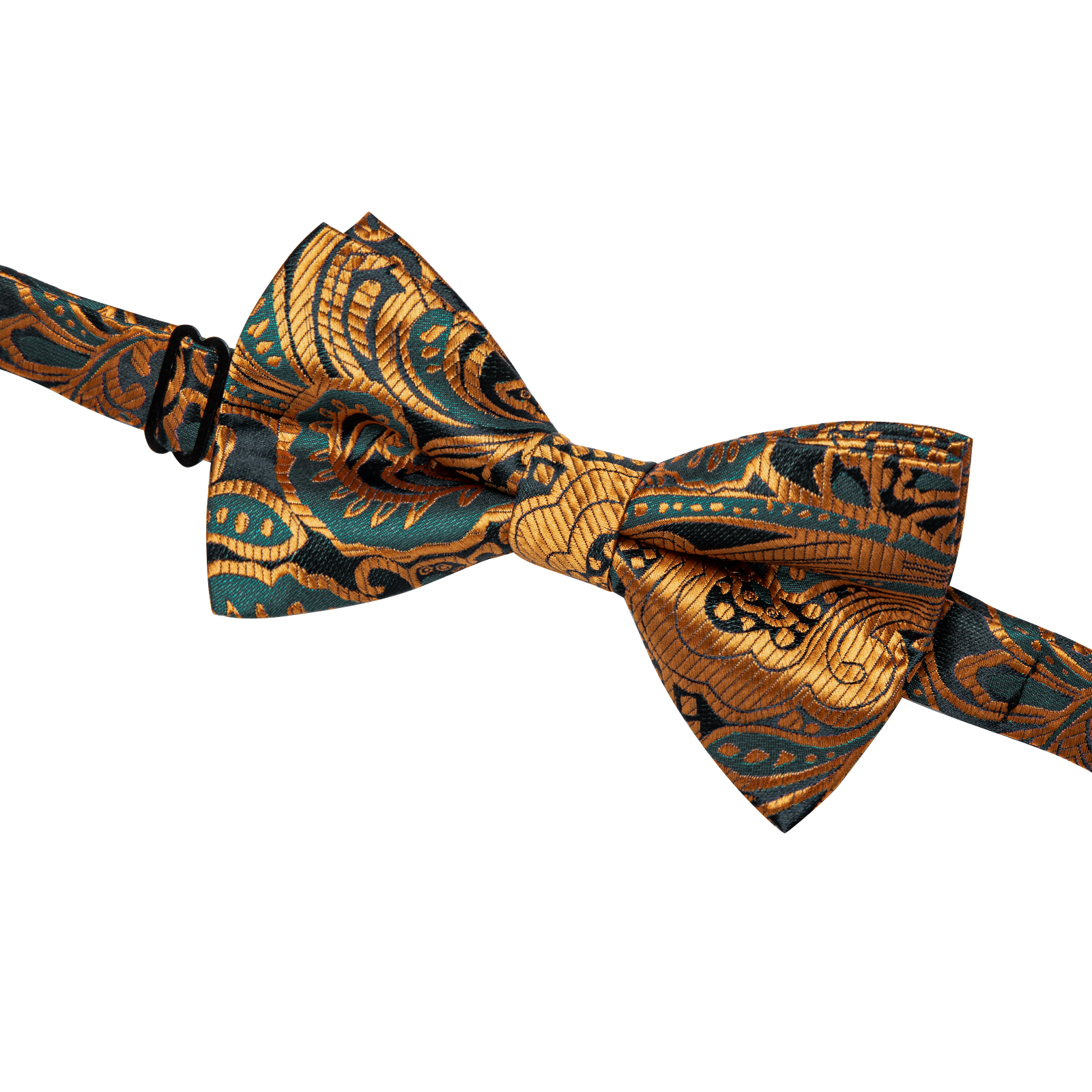 Tags: Amber Gold, Bow Tie, Midnight Black, Paisley, Pre-Tied, Silk, Single Bow-Tie, Teal Blue