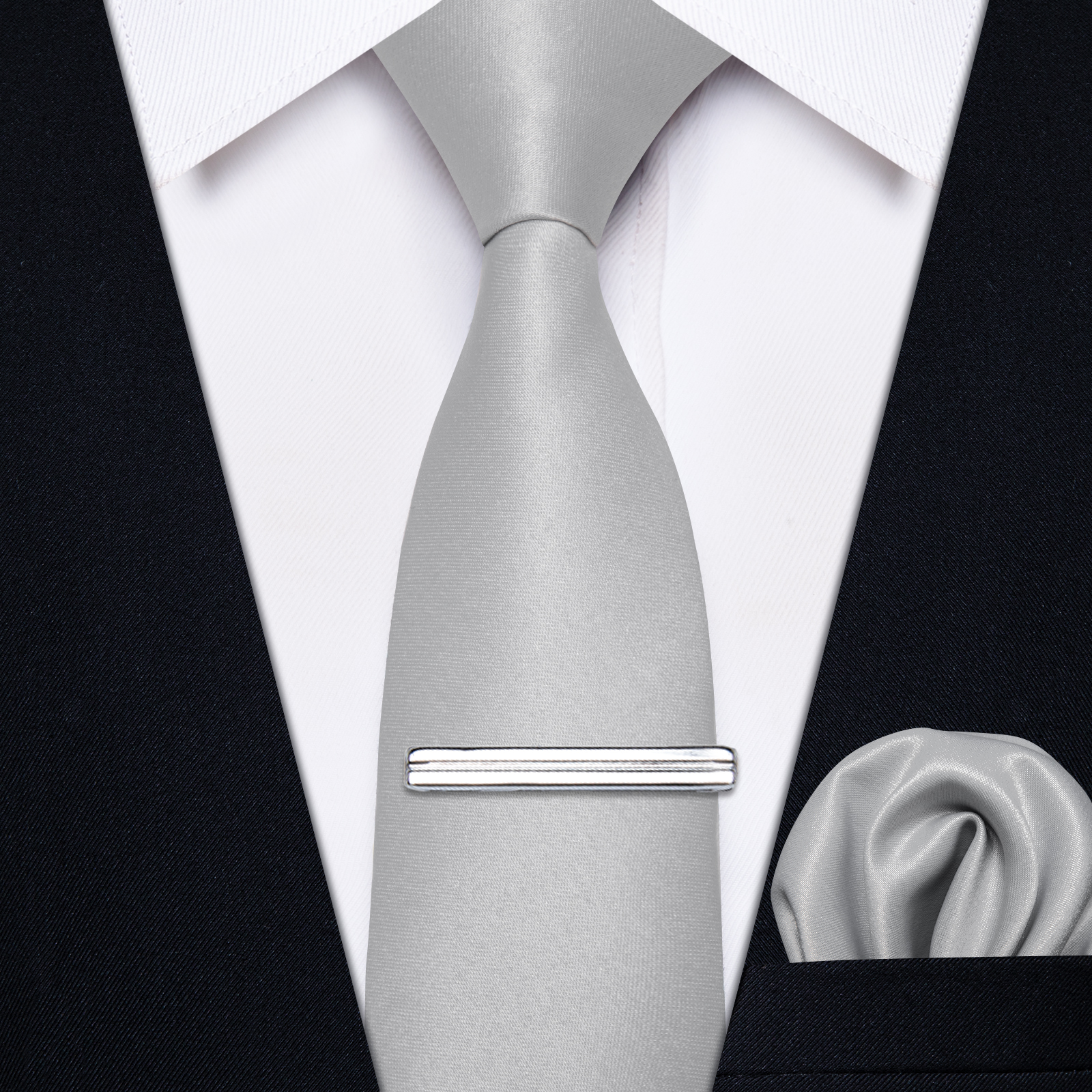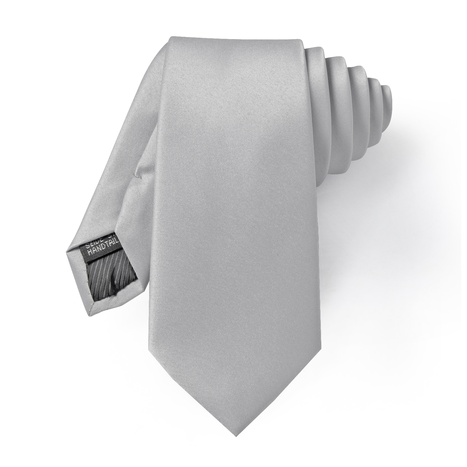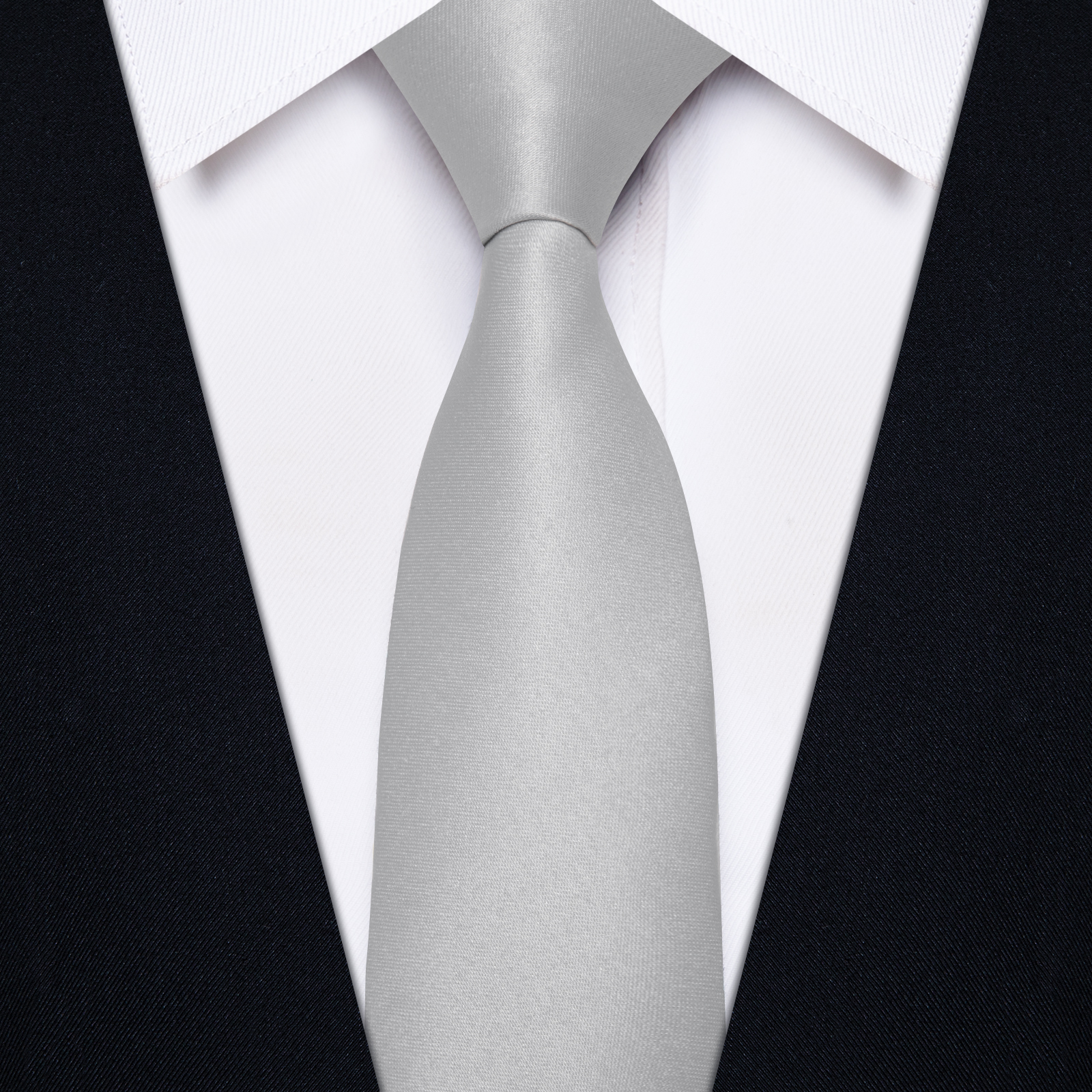 The Platinum Silk Charm Tie adds a touch of modern refinement to any ensemble. Its smooth, silver-toned fabric creates a subtle sheen that catches the light, making it ideal for both special occasions and professional settings. Elevate your look with this classic accessory.