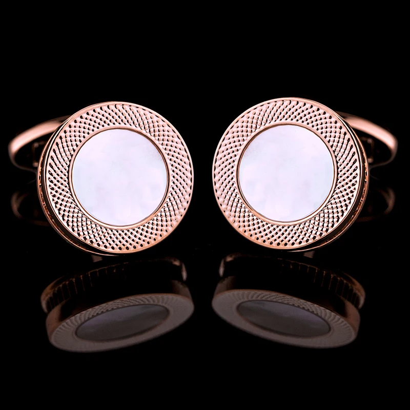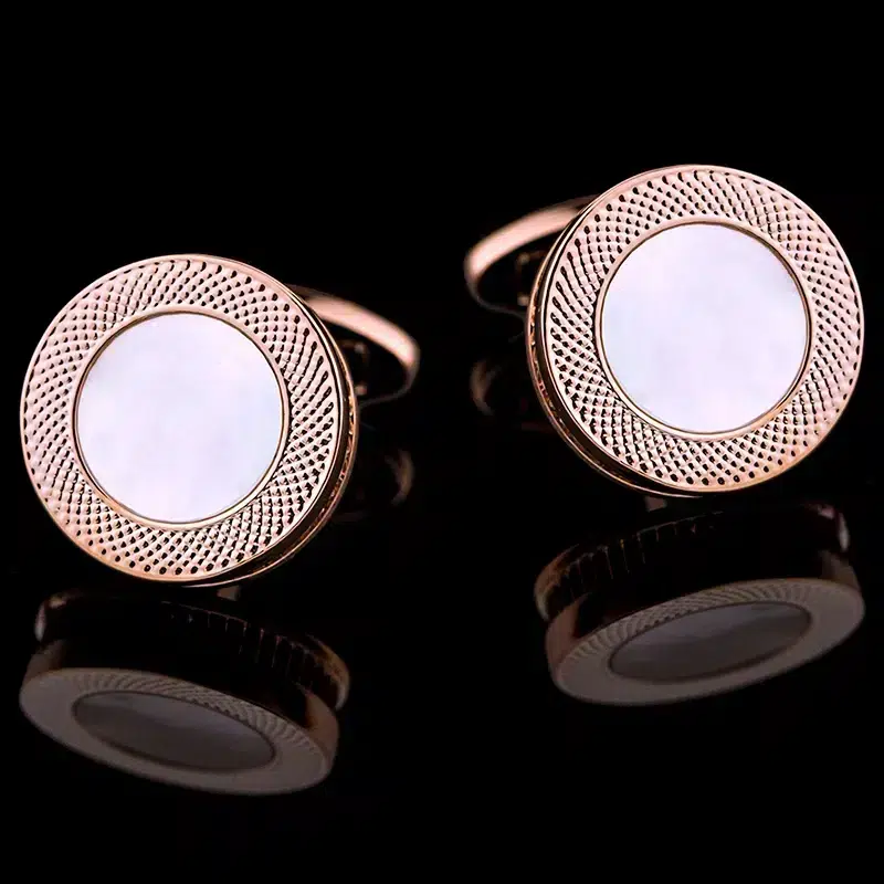 Embrace the essence of refined luxury with the Rose Pearl Radiance Cufflink, a perfect fusion of elegance and modern sophistication. These cufflinks feature a captivating mother-of-pearl center, framed by a meticulously textured rose gold-tone border. The lustrous mother-of-pearl provides a subtle iridescence, beautifully complemented by the warm hue of the rose gold, creating a harmonious blend of classic and contemporary design.