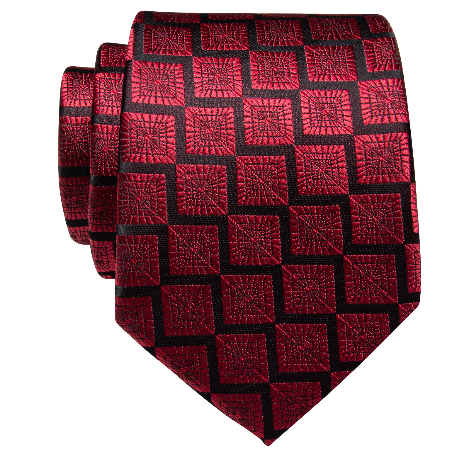 The Ruby Grid Elegance Geometric Tie features a vivid red base with a dynamic black square pattern, creating a bold geometric look.