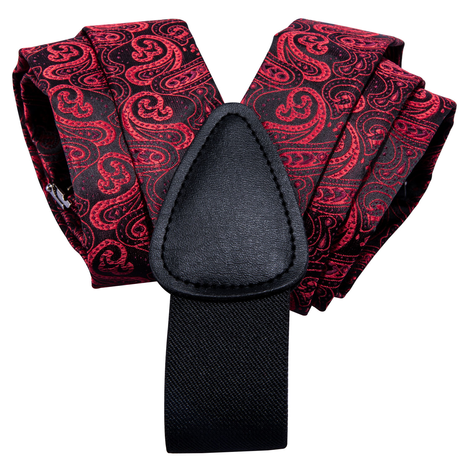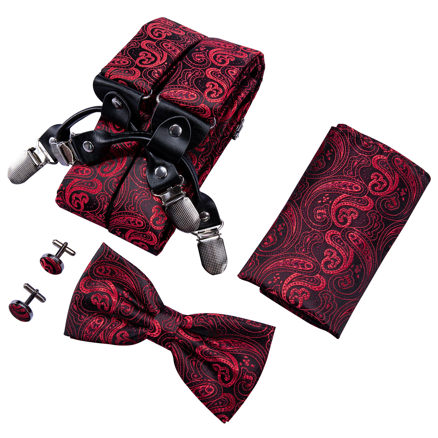 Add a touch of opulence to your wardrobe with the Scarlet Splendor Paisley Suspenders. These suspenders are adorned with an elegant red paisley pattern, expertly woven for a luxurious finish. Perfect for black-tie events, corporate functions, and stylish gatherings, the Scarlet Splendor Paisley Suspenders combine classic charm with contemporary flair. The set includes a matching bow tie, pocket square, and cufflinks, ensuring you look impeccably stylish. With adjustable straps and robust clips, these suspenders provide a comfortable and secure fit.