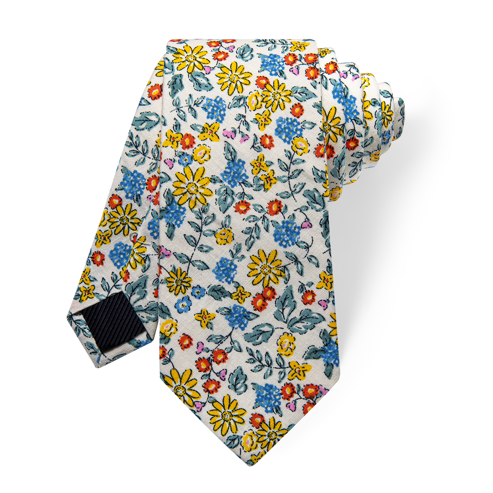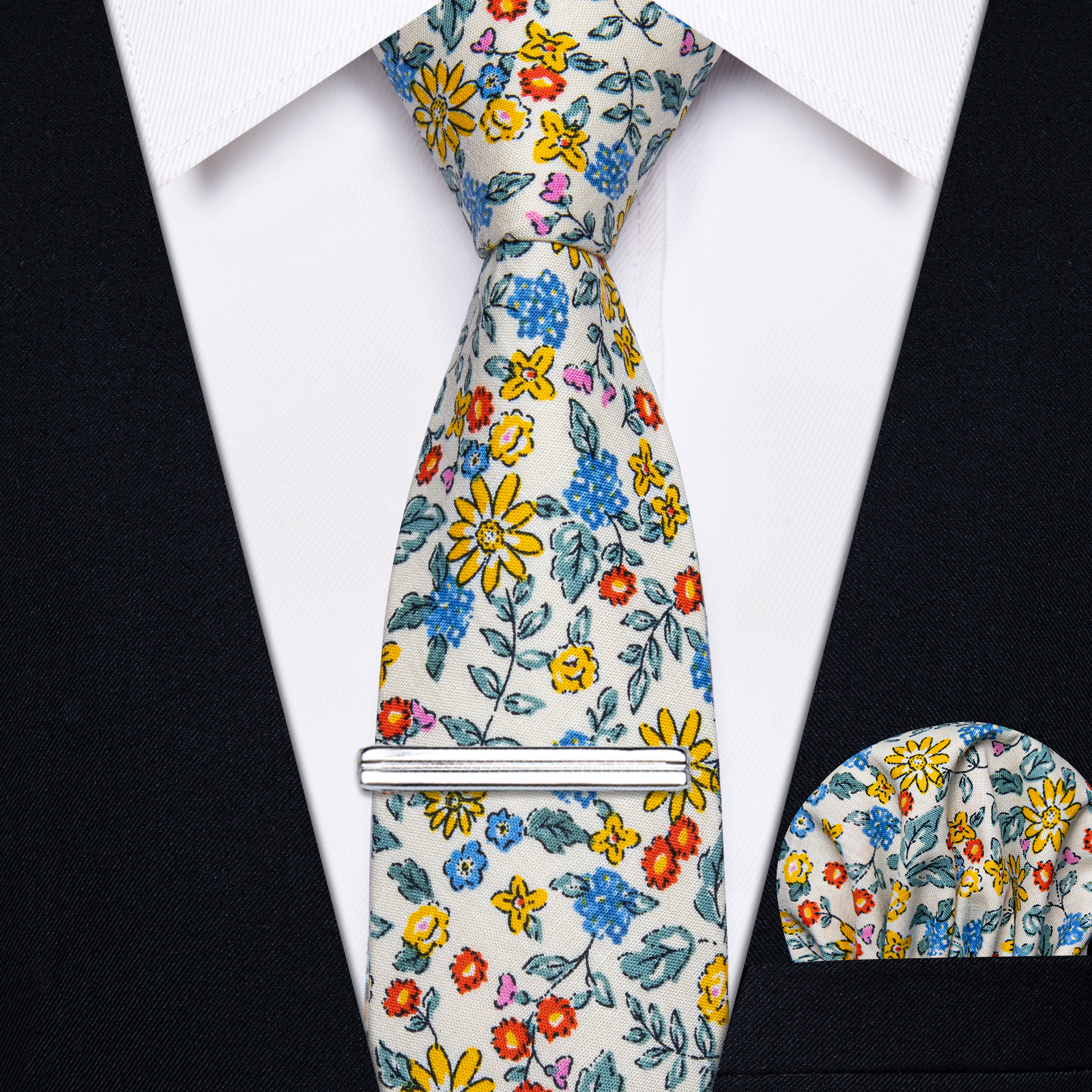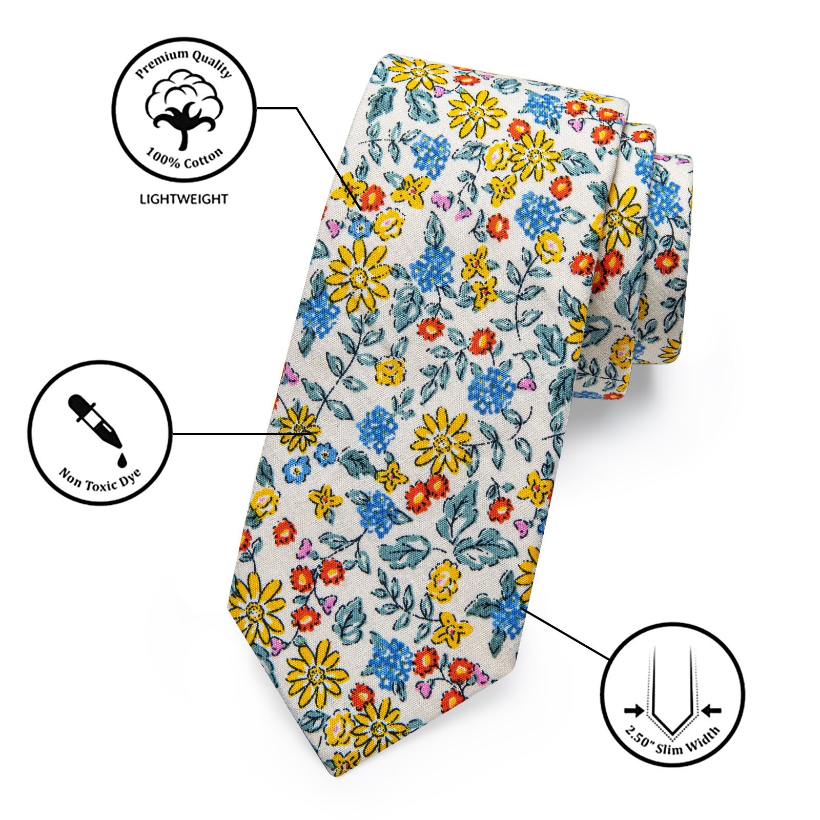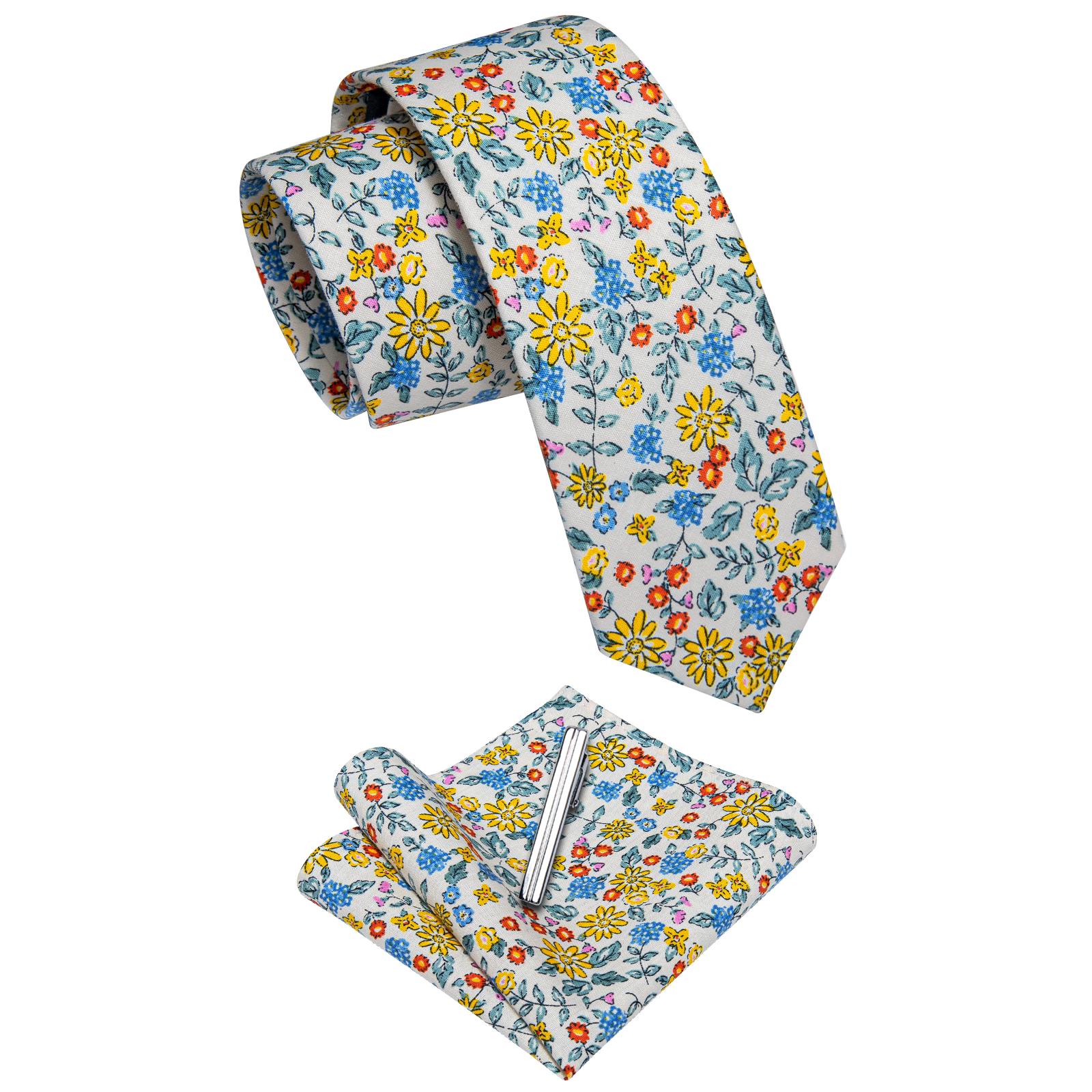 The Wildflower Symphony Floral Skinny Tie captures the essence of a blooming garden with its off-white base and colorful floral pattern in yellow, blue, and red. Designed for those who enjoy making a statement with their accessories, this tie pairs well with a range of outfits, from casual blazers to formal suits, bringing an effortless touch of charm to any look.