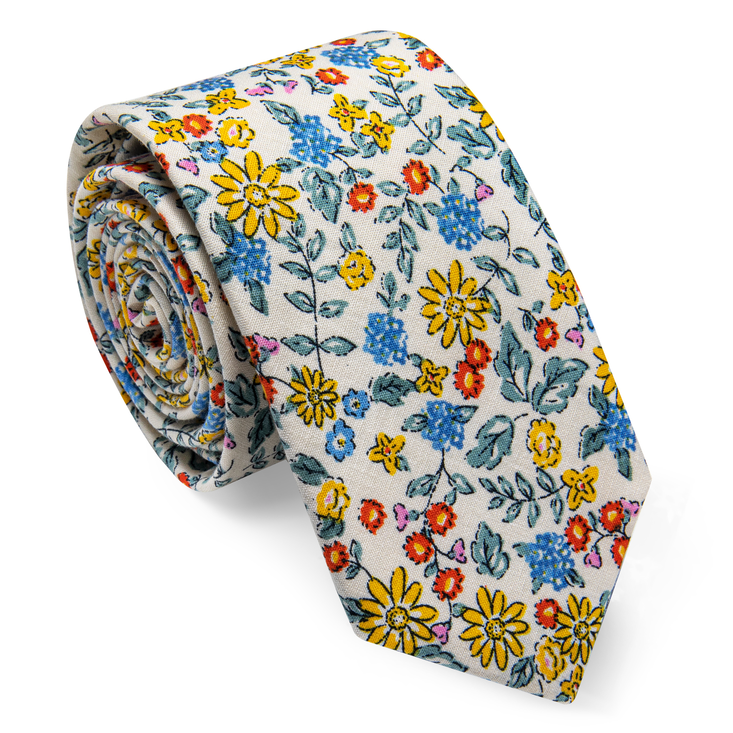 The Wildflower Symphony Floral Skinny Tie showcases an off-white base with yellow, blue, and red floral designs, creating a refined yet vibrant style.